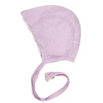 Hjelmen er cremefarvet med hulmønster. Joha babyhuen har en sød blondekant og lukkes med bindebånd.