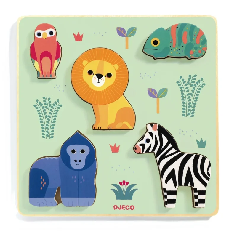 Lækkert træpuslespil for de mindste fra Djeco. Puslespillet er med 5 tykke brikker der forestiller søde dyr. Her er en papegøje, en kamæleon, en løve, en gorille og en zebra - alle tegnet i Djecos fine streg med et lille strejf af humor. Brikkerne er ret kraftige, så de er også velegnede som klodser, der kan leges med og stables ovenpå hinanden. Puslespillet fremmer finmotorikken samt genkendelse af former og figurer.