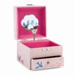 Et skønt smykkeskrin fra Djeco. Spiller en fin melodi når man åbner låget, mens den søde fugl danser rundt. Smykkeskrinet har en fint rum når du åbner låget, samt en skuffe.