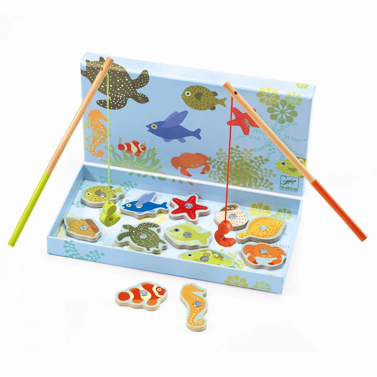 Lækker æske med 12 søde magnetiske træ-havdyr samt 2 fiskestænger. Så kan jagten begynde.