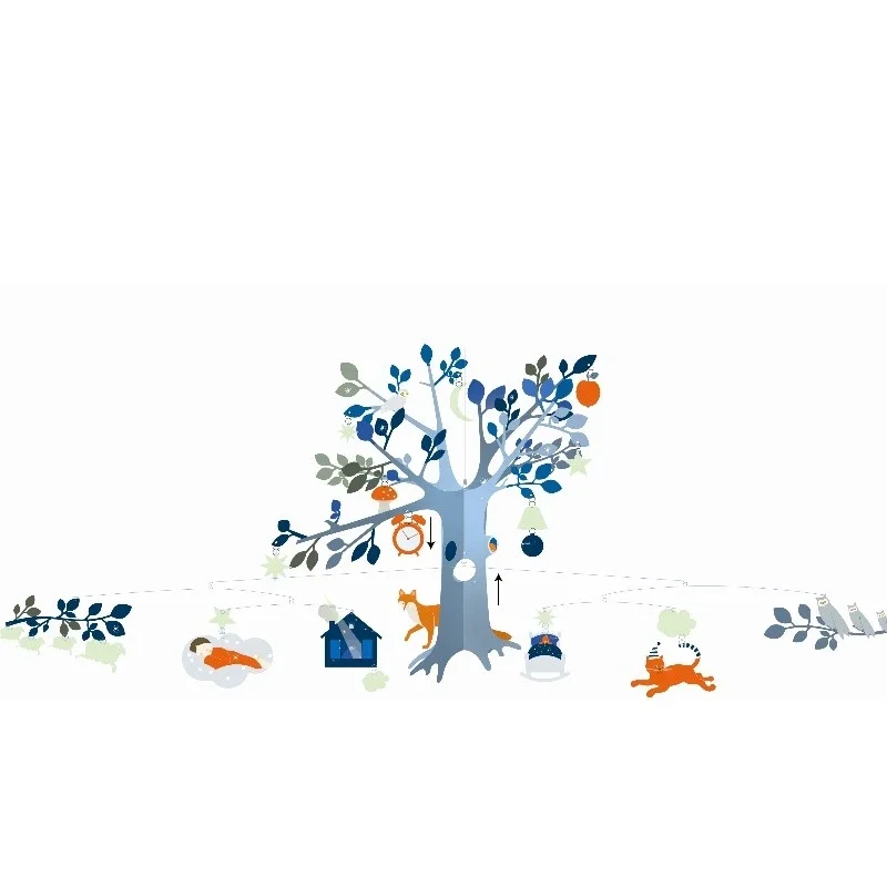 Uro - En forunderlig nat. Kæmpe stor uro i dæmpede farver fuld af liv under det store flotte træ. Uroen har selvlysende detaljer, når mørket falder på.