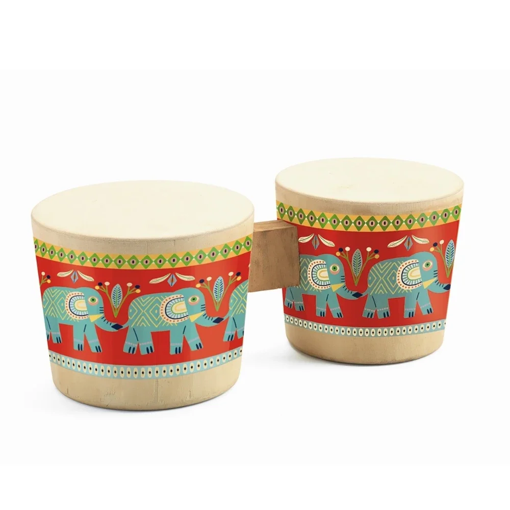 En flot bongo tromme smukt illustreret med blå elefanter på række. Et klassisk musikinstrument der altid skaber glæde hos musikelskende børn.