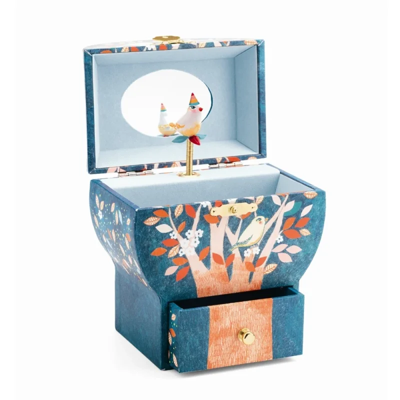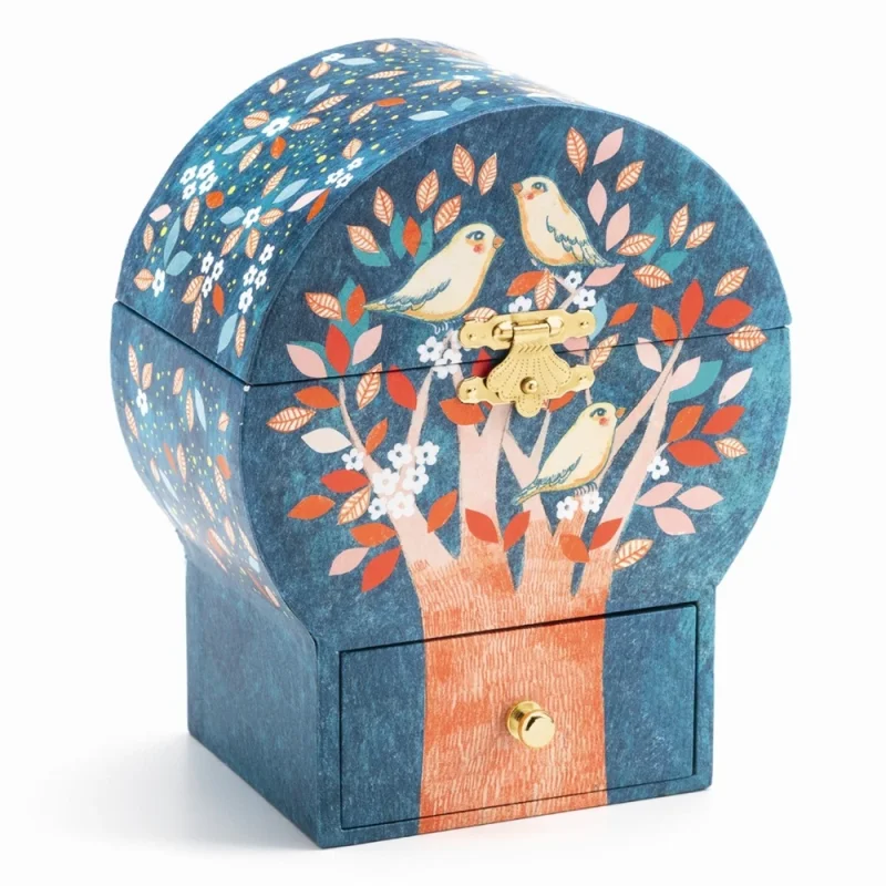 Et meget poetisk smykkeskrin fra Djeco med en smuk illustration af et træ med fine fugle. Indvendigt er en smuk fugl, der snurrer rundt til musikken, når låget åbnes. Musik: ""Santa Lucia"".