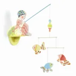 Spændende træuro fra Djeco, til at montere på væggen. På den lille hylde, sidder den søde bjørn med sin fiskestang, og fanger farvestrålende fisk.