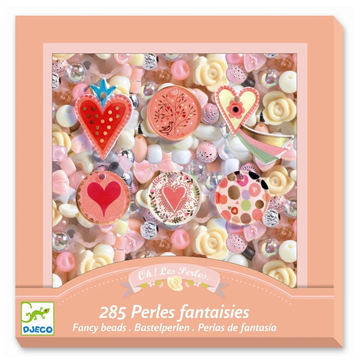 En æske fuld af farverige plastperler og smukke vedhæng fra Djeco, så du kan skabe dine egne flotte halskæder eller armbånd. Eller giv en halskæde til din mor, med et smukt hjerte.