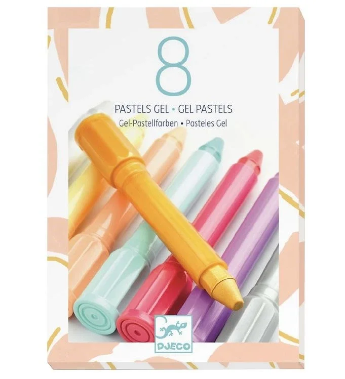 Pakke med 8 lækre gelfarver fra Djeco. Gelfarverne er i smart plastikskrueholder med låg, der gør det nemt at holde ved farverne uden at få fedtede fingre. Farverne består af 8 forskellige pastelfarver og er super nemme og bløde at tegne med.