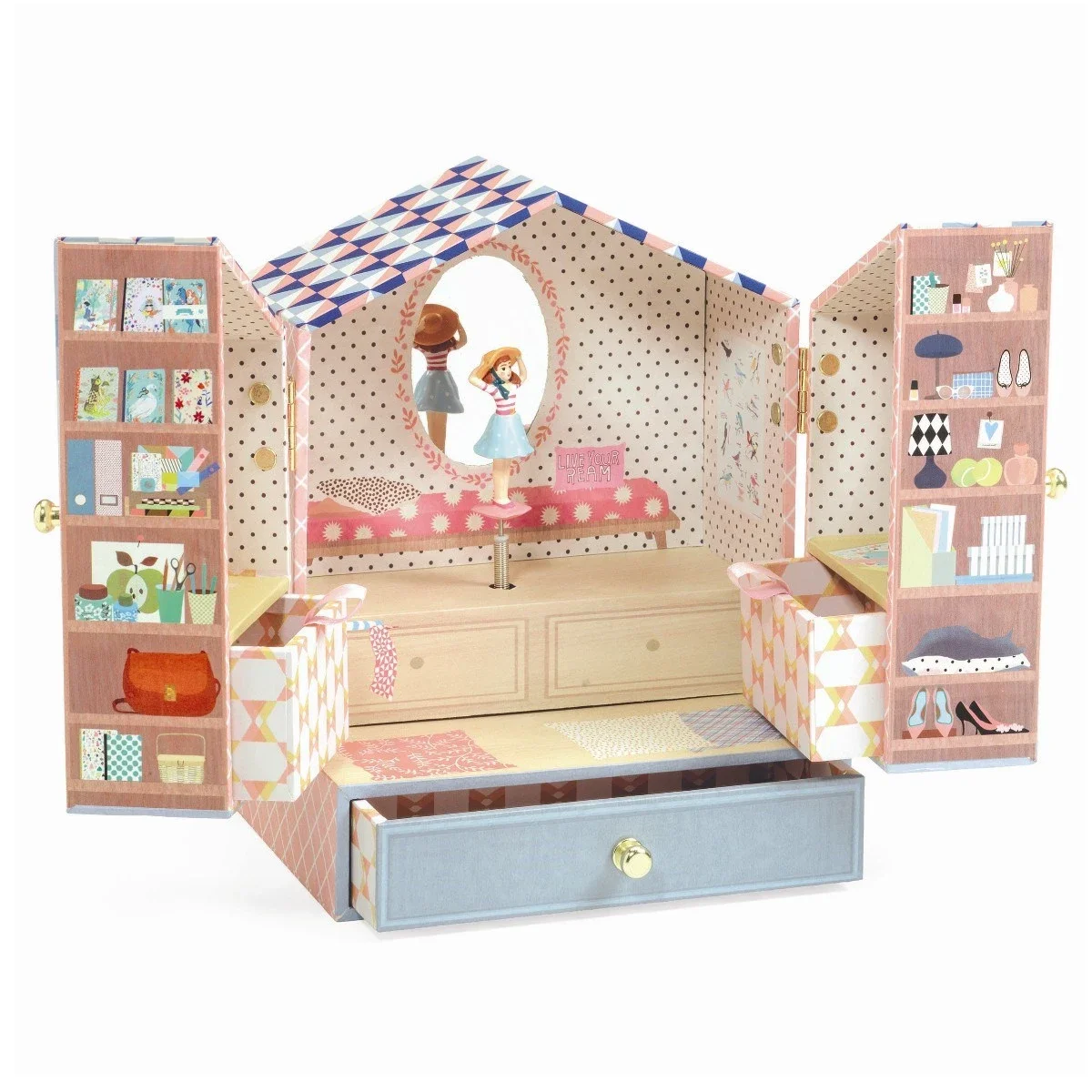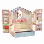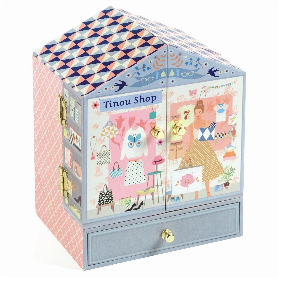 Et sødt og sjovt smykkeskrin fra Djeco. Skrinet er udformet så det ligner, at du åbner op til en lille butik. Inde i skrinet står Tinou klar til at danse rundt foran spejlet, når du trækker musikken op. I skufferne og på hylderne er der plads til dine smykker. Melodi: "The Magic Flute", Wolfgang Amadeus Mozart.