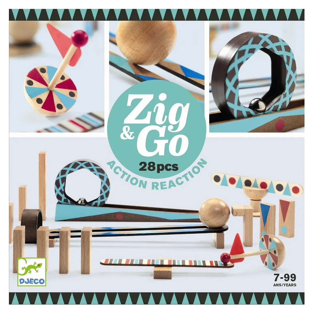 Zig & Go serien fra Djeco er en spændende serie hvor du skal bygge din helt egen bane , hvor de forskellige elementer sætter gang i en kædereaktion af forskellige bevægelser og aktiviteter. Nogle er langsomme først, men accelerer pludselig, mens andre steder giver det en musisk rytme.