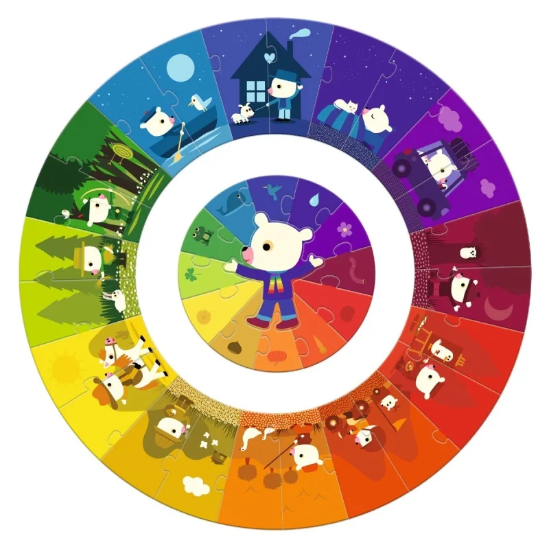 Sammen med den søde bjørn kan du lære om alle regnbuens farver i dette sjove og flotte puslespil. Puslespillet består af 24 brikker i den udvendige cirklen og 13 brikker i den indvendige cirkel. Der er masser af tale om med barnet, både omkring farverne, men også om de mange søde situationer bjørnen befinder sig i.