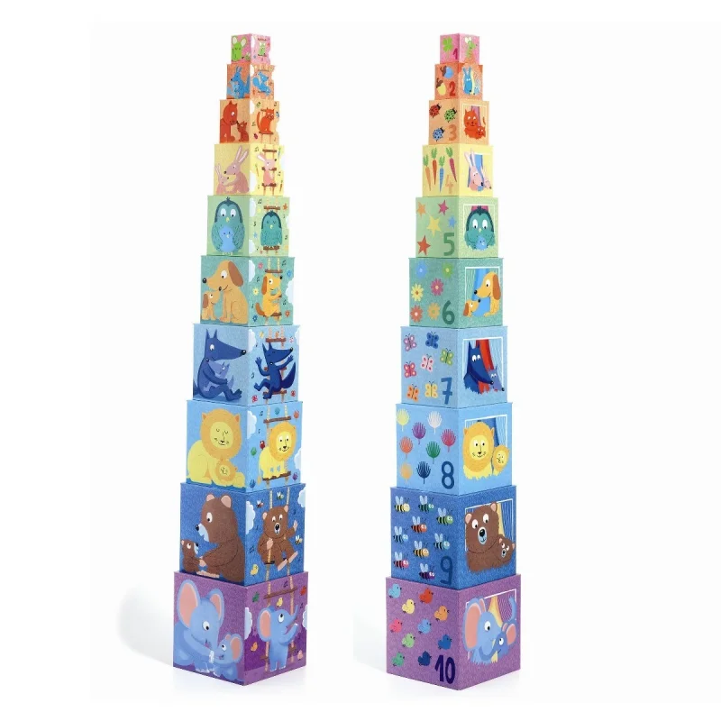 Djeco laver de flotteste stableklodser i kraftig pap. Børn elsker at stable dem, vælte dem, samt pakke dem sammen inde i hinanden. En god øvelse der lærer om størrelsesforhold. Derudover er der så mange fine tegninger af dyr, der kan lægge op til snak om dyr, farve og former. På den ene side af klodserne er der tallene 1 - 10, hvor du kan lære barnet om antal
