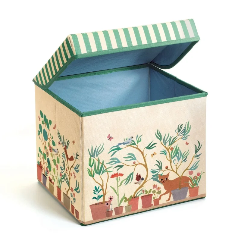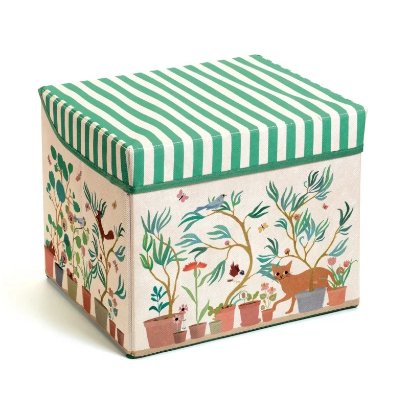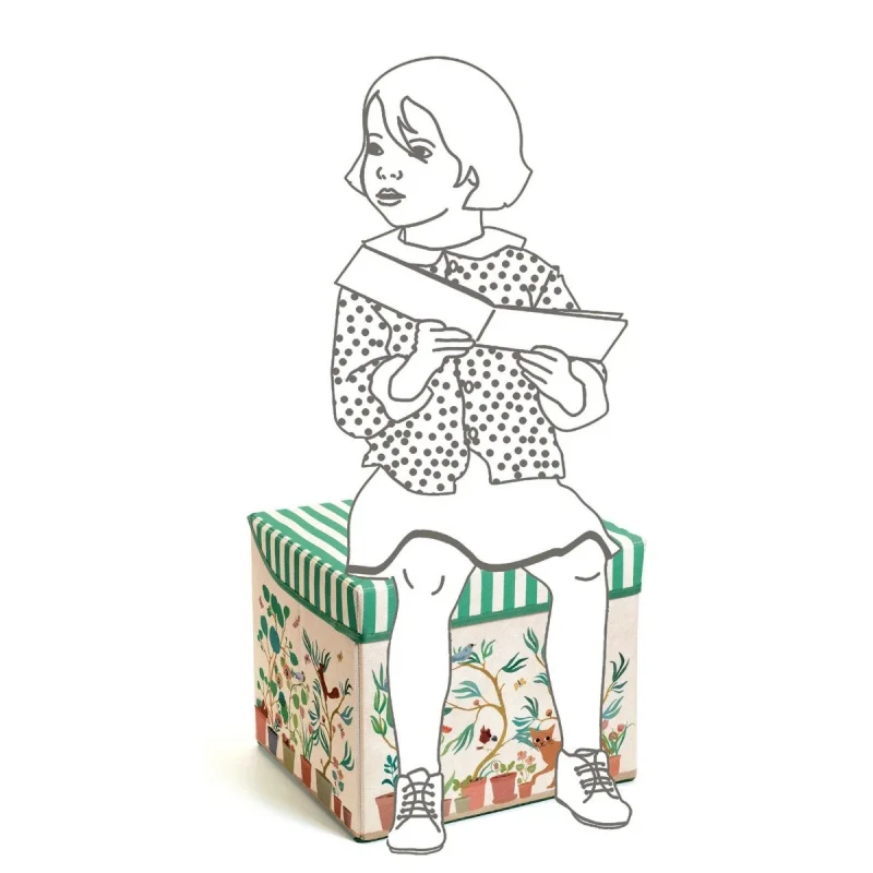 Legetøjs kasse som er lavet så den også er en skammel, kan bruges til at sidde på i et telt, eller til at stå på hvis der er noget man ikke kan nå. Flot motiv, en del af Little Big Room fra Djeco