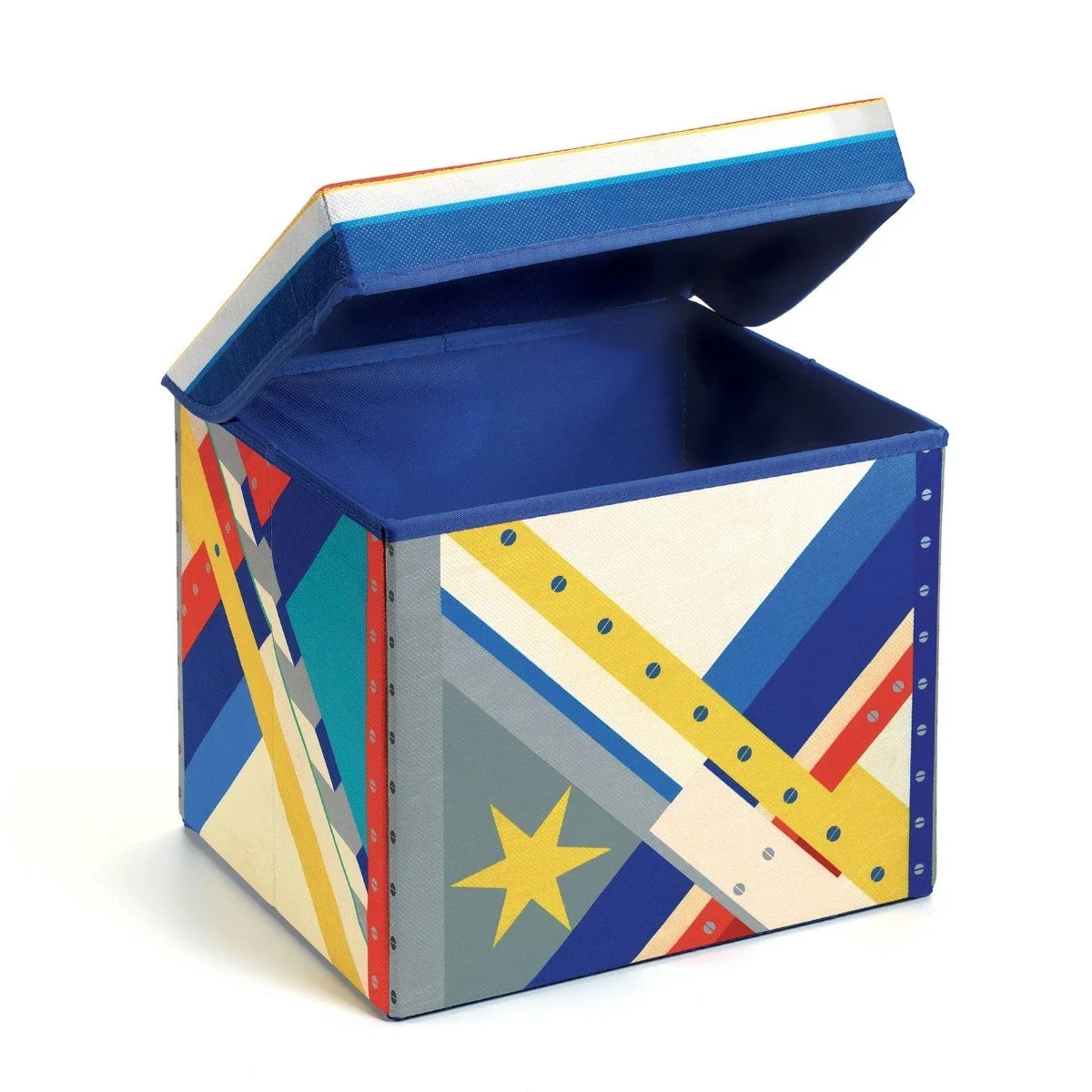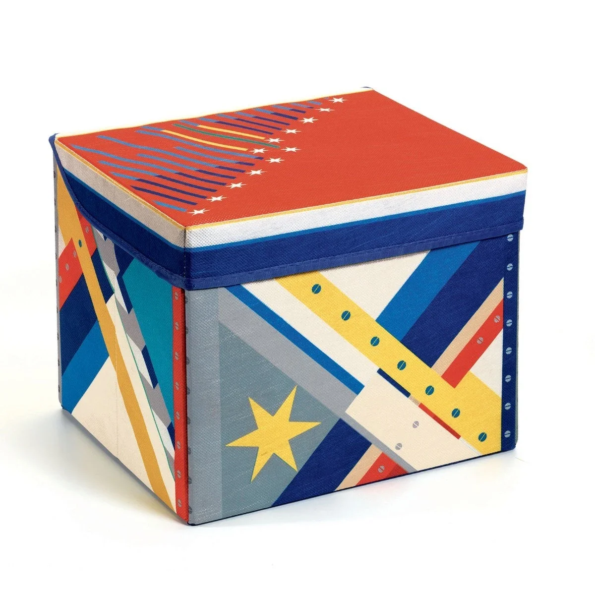 Legetøjs kasse som er lavet så den også er en skammel, kan bruges til at sidde på i et telt, eller til at stå på hvis der er noget man ikke kan nå. Flot motiv, en del af Little Big Room fra Djeco