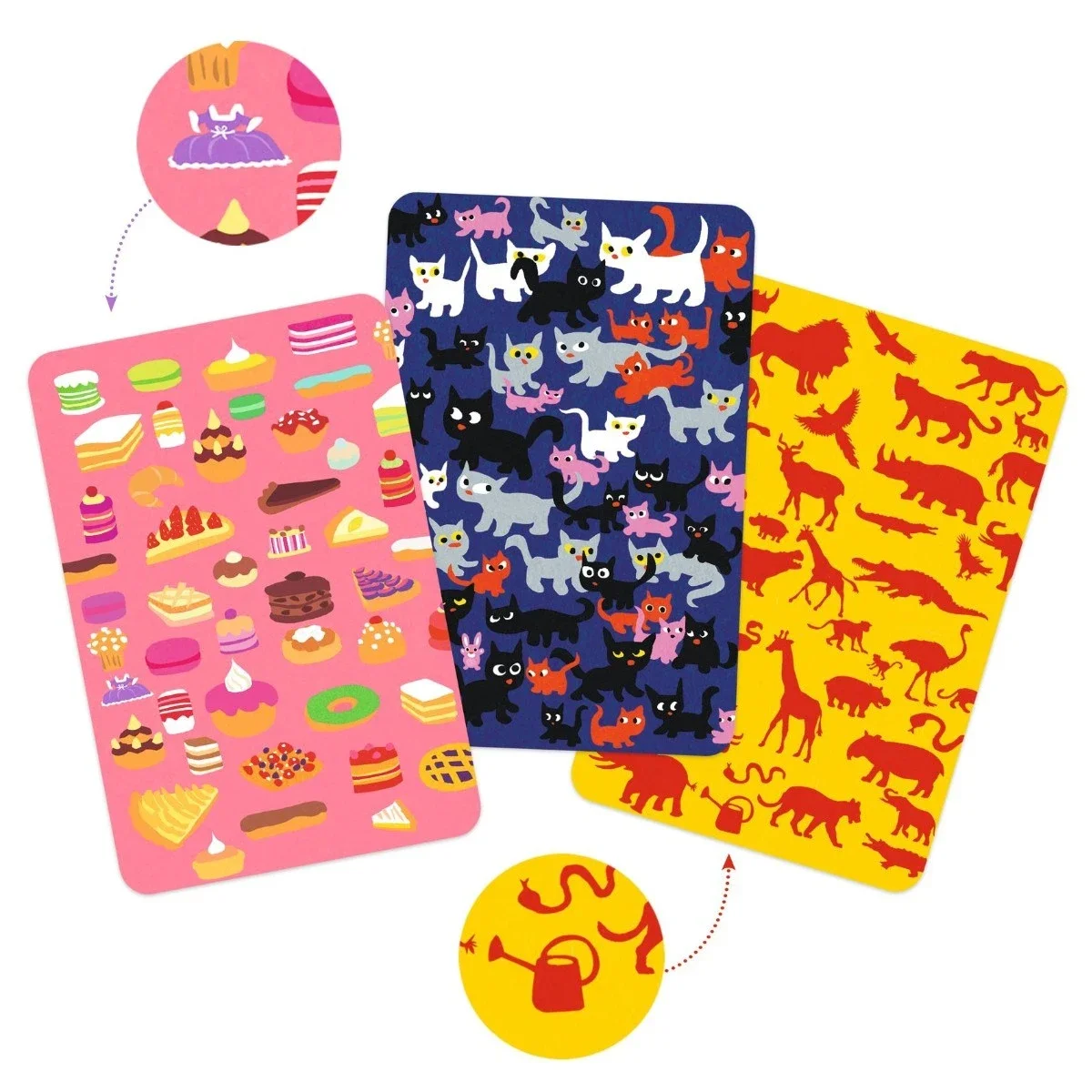 Hvem er hurtigst til at finde den ting, der ikke passer til resten af motiverne. Det kræver et vågent øje. Djeco har en tradition for at lave sjove kortspil for hele familien.