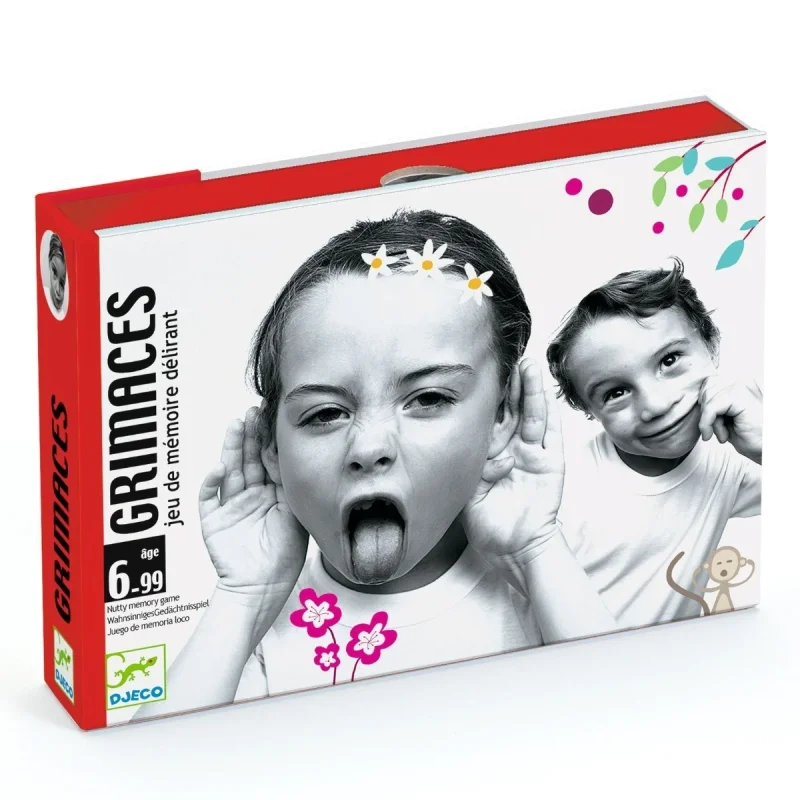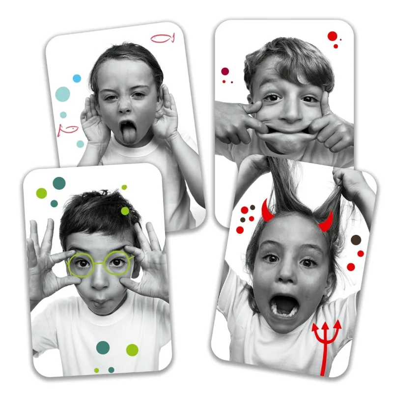 Et rigtigt sjovt spil for alle i familien. Spillet er rigtig sjovt, når det spilles med 2 hold med hver 2 deltagere. En deltager på hvert hold trækker 6 grimassekort. Disse skal nu hurtigst muligt huskes, hvorefter man går i gang med at lave grimasserne, mens ens makker skal forsøge at gætte, hvilke grimasser, der er tale om. Den der har gættet flest rigtige, vinder omgangen. Næste runde skifter man internt på holdet, så den anden spiller nu skal udføre 6 grimasser som der trækkes på ny.