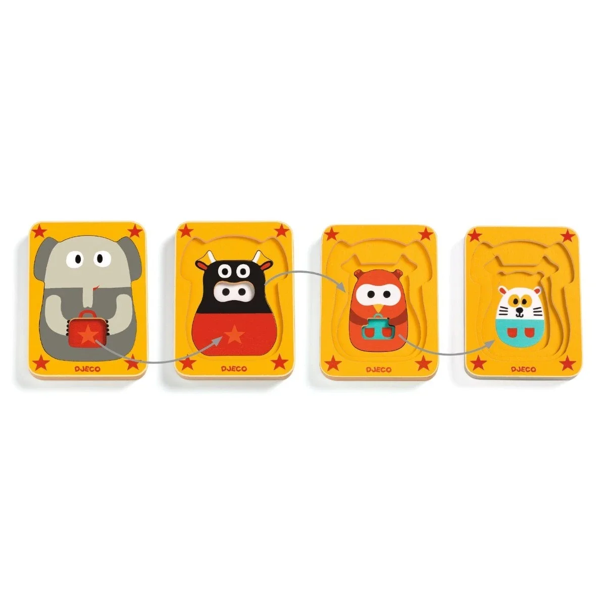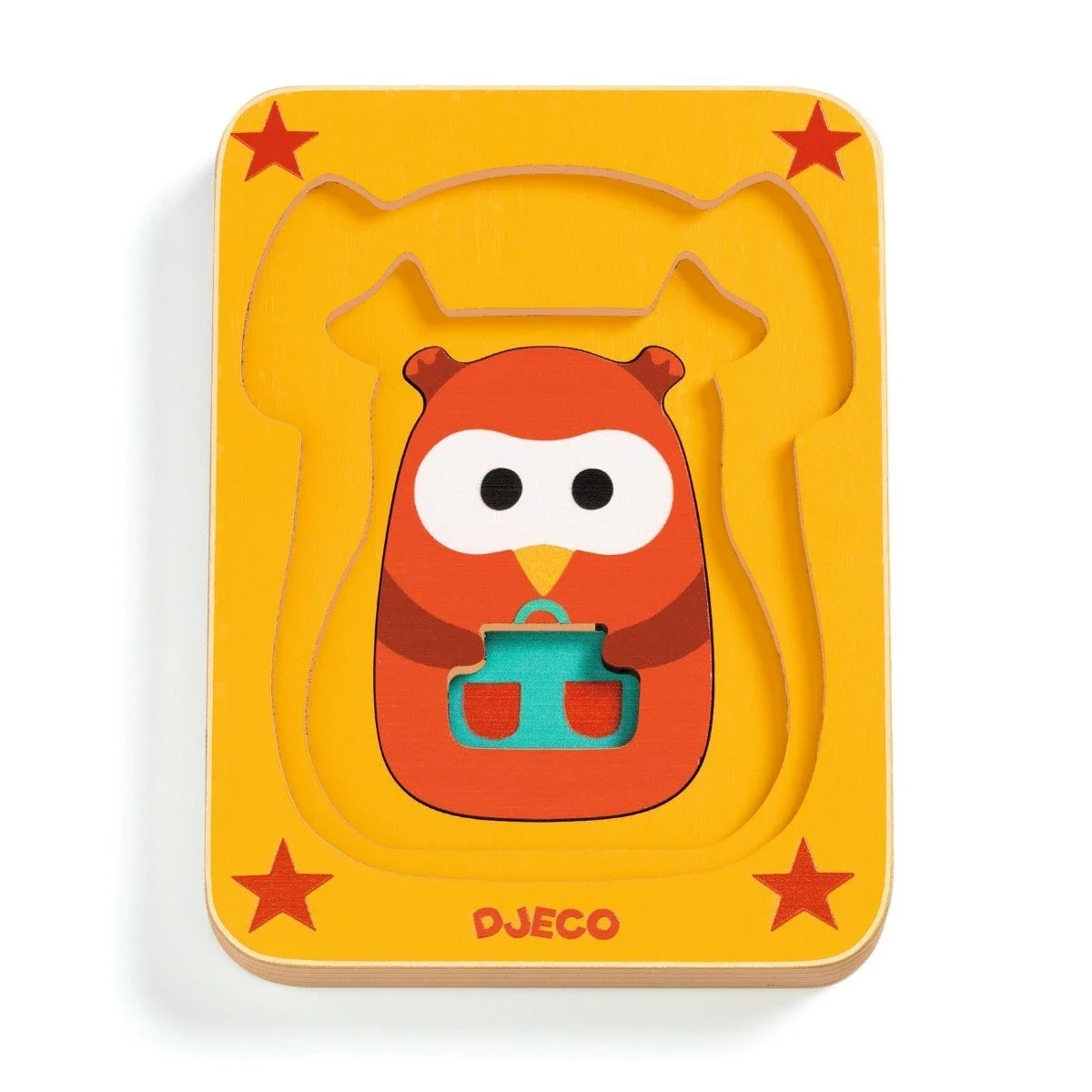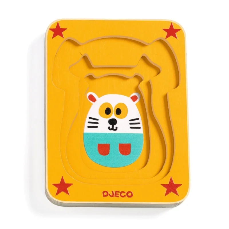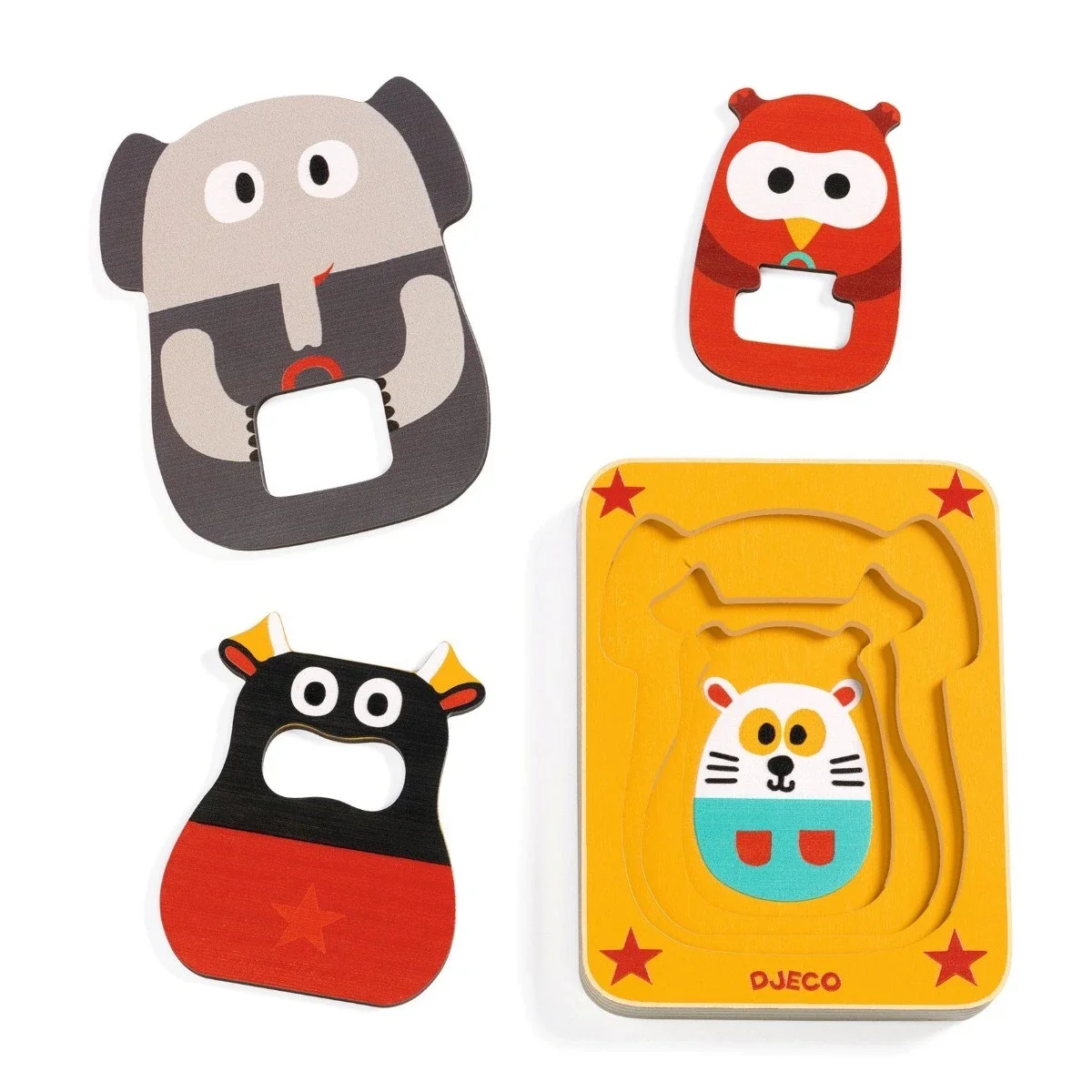 Djeco Lag-på-lag - Leo & co.Det sjove lag-på-lag puslespil fra Djeco gemmer på et nyt dyr og overraskelse for hvert lag du kommer igennem. F.eks. er elefantens kuffert, faktisk koen's busker osv.