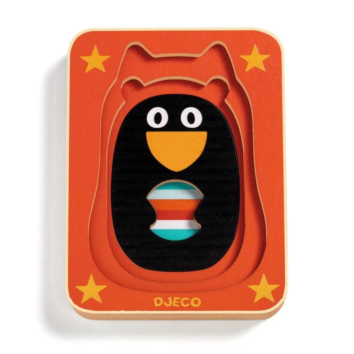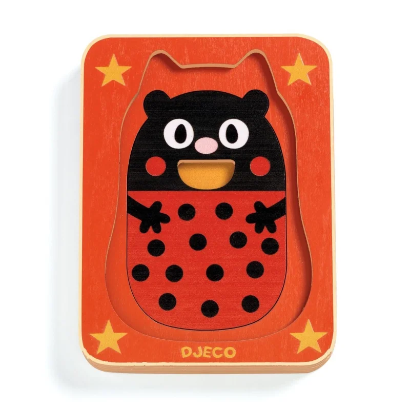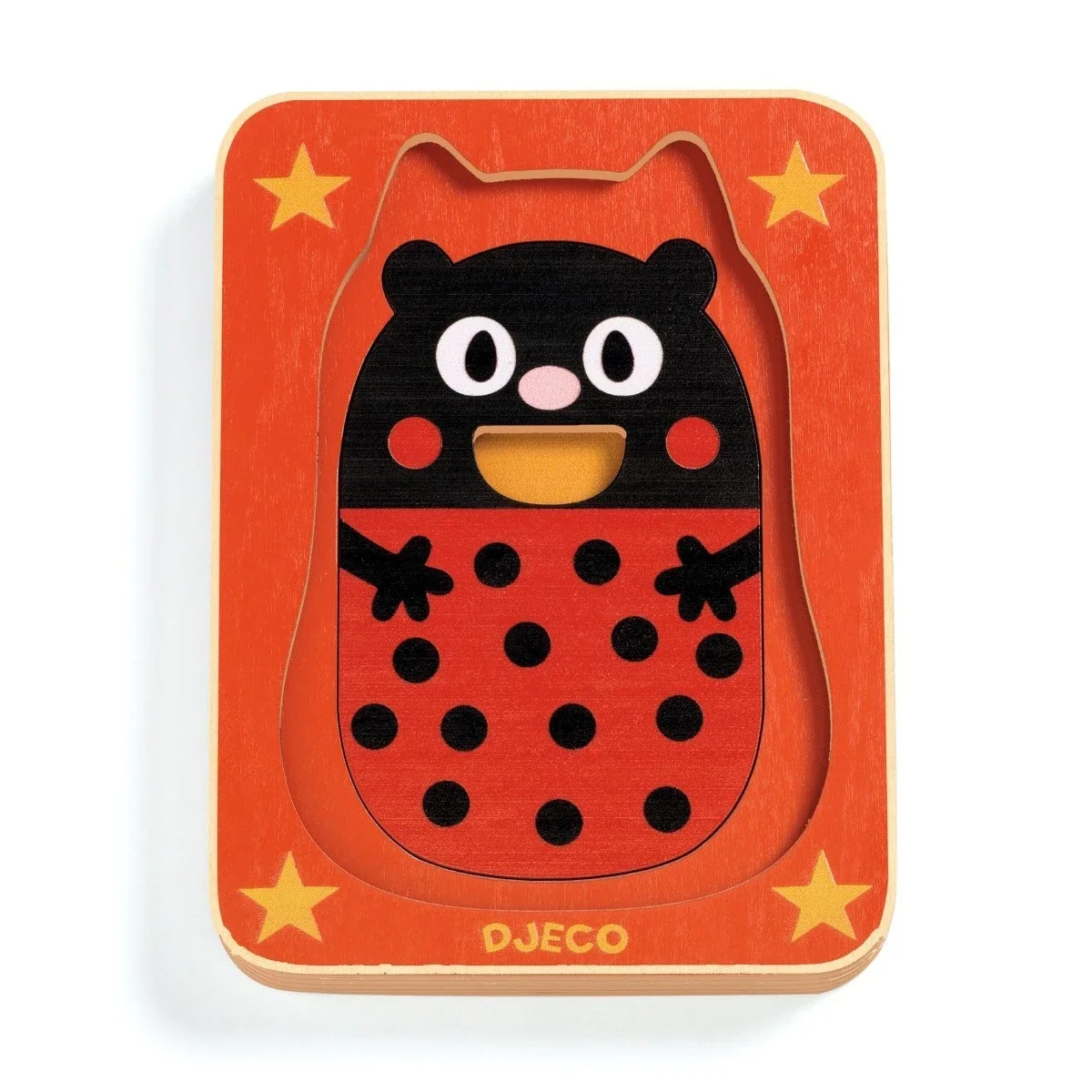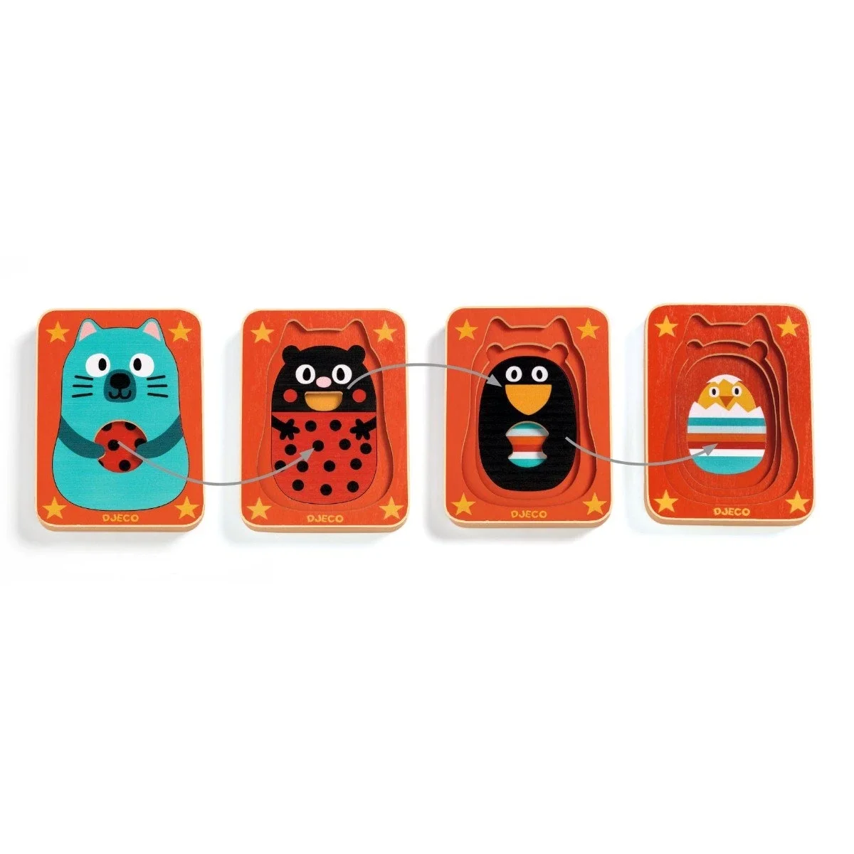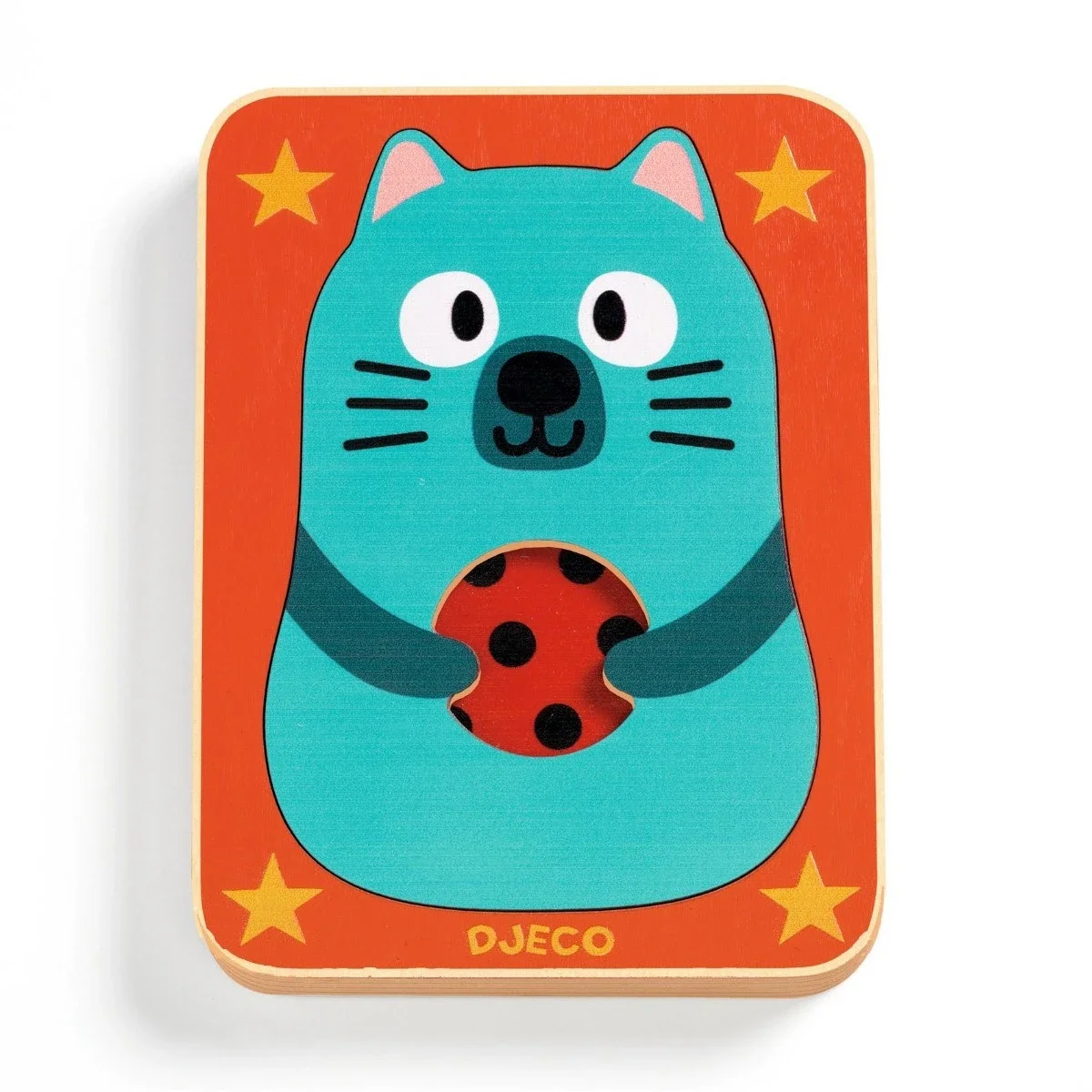 Det sjove lag-på-lag puslespil fra Djeco gemmer på et nyt dyr og overraskelse for hvert lag du kommer igennem. F.eks. er kattens bold faktisk mariehønens krop osv.