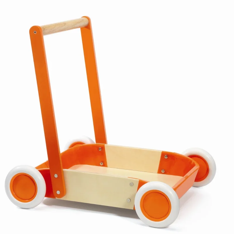 Flot rød gåvogn til at holde balancen med når barnet skal lære at gå. I ladet på gåvognen kan barnet have sit ynglings legetøj med på tur.