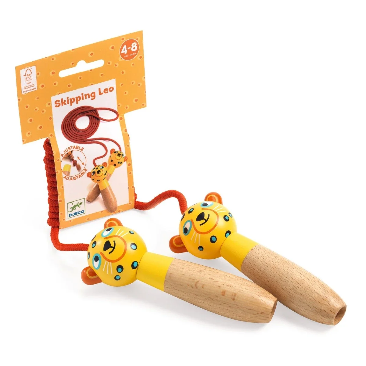 Et smukt tiger-sjippetov fra Djeco. Længden justeres ved at skrue et af håndtagene af, juster længden med en knude. Håndtaget skrues på igen og så er det klar til brug.