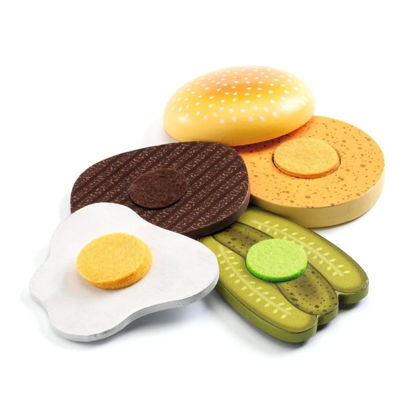 Djeco laver fantastiske æsker med legemad, der rigtig kan sætte gang i både fantasi og rolleleg. Her er det en god omgang burger med pommes Frites, og hvor du selv kan vælge, hvor meget du ønsker at putte i din burger. En sjov kombination af træ samt filt.Mål: 22,5 x 17,5 x 6 cm