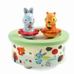 Fin lille spilledåse i træ, hvor kaninen og egernet har hovedrollerne.