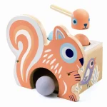 Et sjovt og sødt hammerbræt fra Baby White. De fine trækugler skal hamres ned i egernets kasse, hvor de triller ud igen .... lige klar til en omgang mere. En rigtig god motorisk øvelse der kan gøres om og om igen.