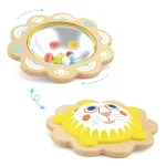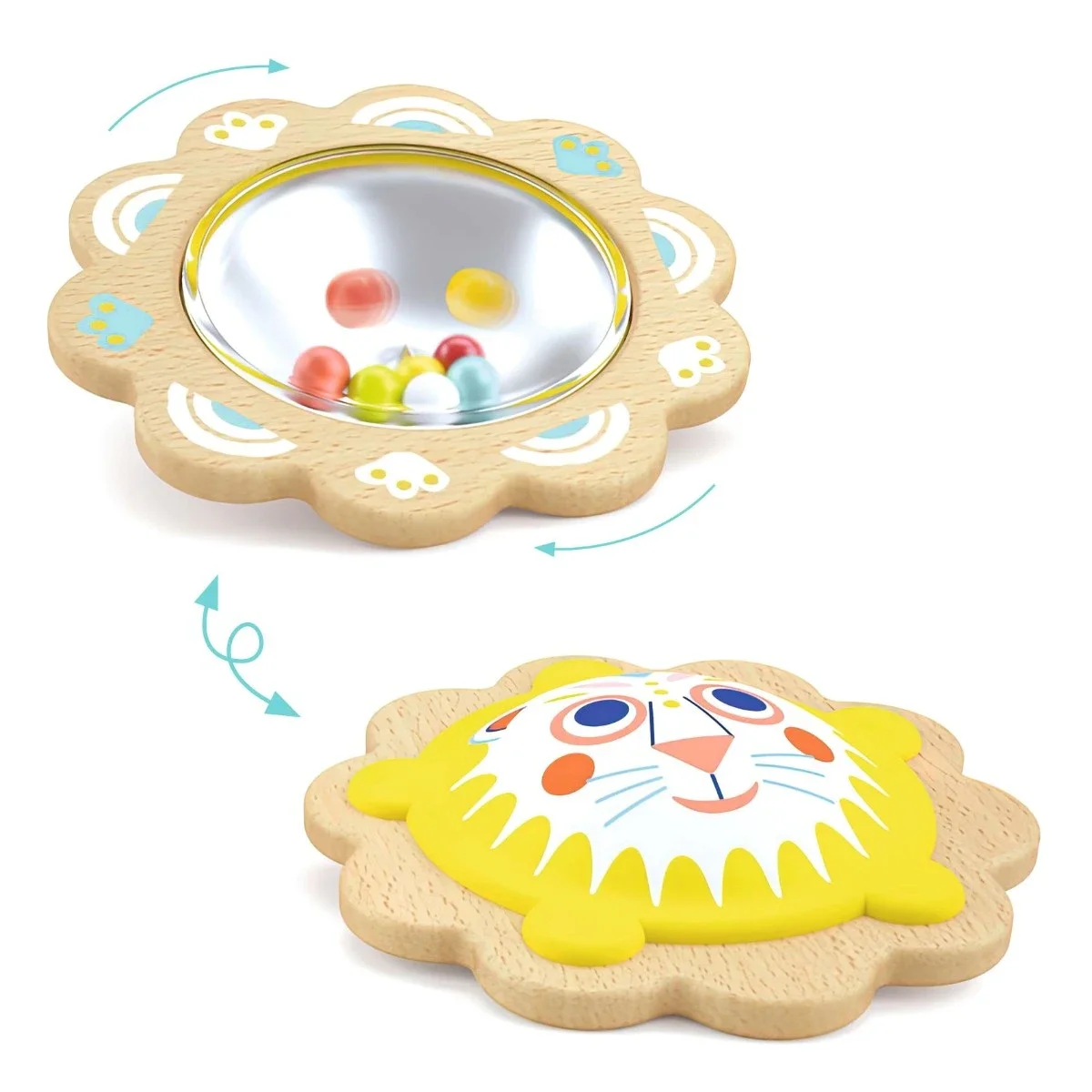 Den sjove rangle fra Djeco i træ og plast har et sødt løveansigt på den ene side, og på bagsiden kan du se de små kugler fare rundt, når ranglen rystes.