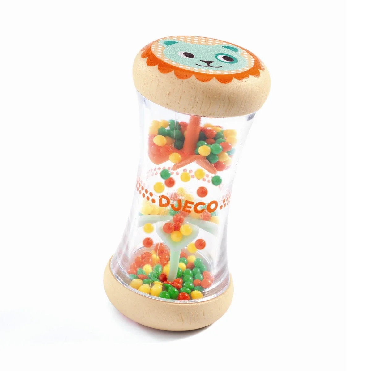 Flot regnmager i friske farver. Barnet vil fryde sig over at se og høre de fine, farvede plastkugler løbe fra den ene ende til den anden ende om og om igen. Et klassik legetøj til de mindste i Djecos smukke stil.