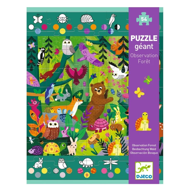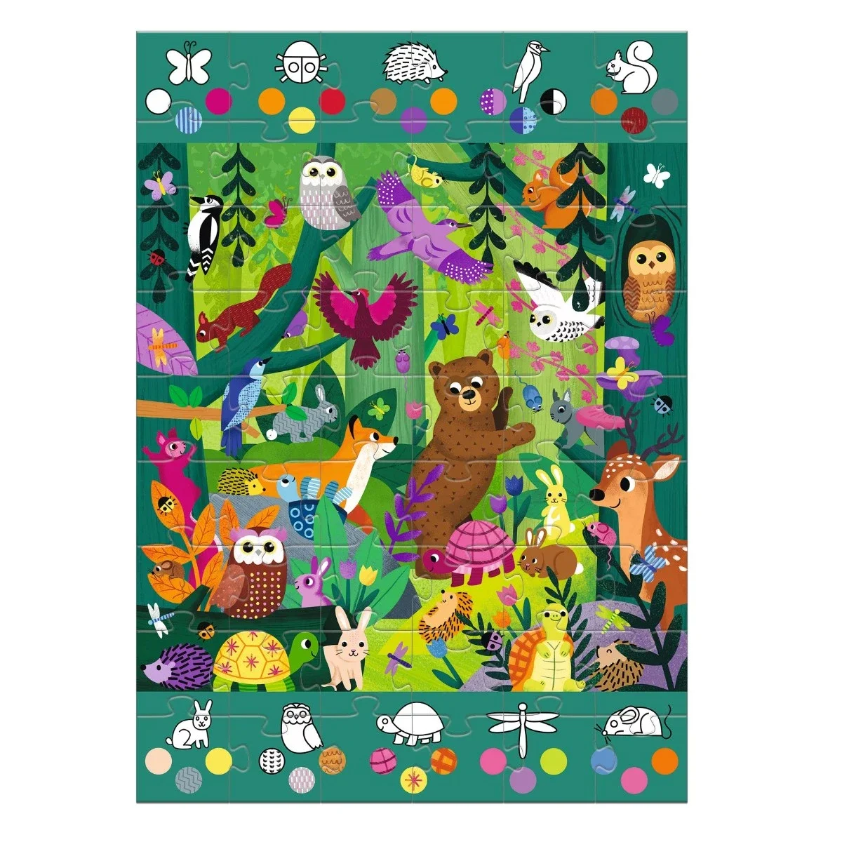 Et kæmpe stort puslespil fuld af en masse søde dyr. Når du har lagt puslespillet kan du gå på opdagelse i det. Rundt i kanten er afbilledet en masse forskellige farver, mønstre samt dyr. Se om du kan finde dem alle sammen i motivet.