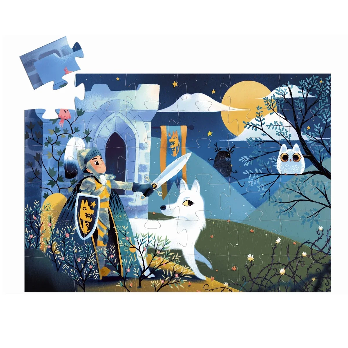 Djecos klassiske silhuetpuslespil i smukke æsker. Her en ridder i måneskin. Bag på æsken ses puslespillets motiv. 36 brikker i alt.