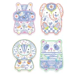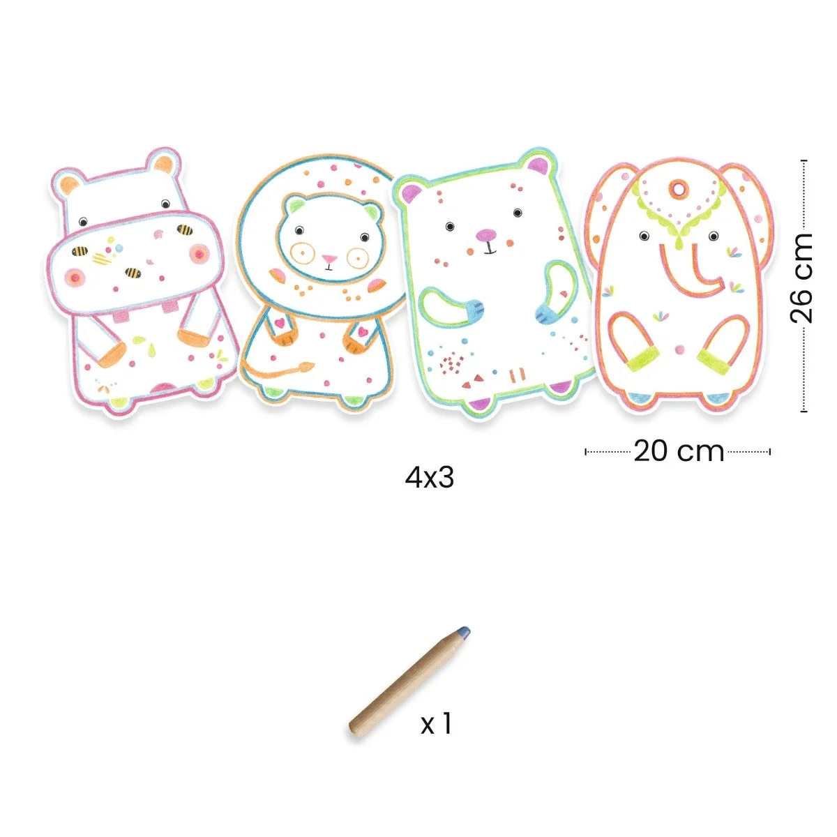 Ny kan de allermindste også skabe en flot tegning! De store og søde dyr måler hver ca. 20 x 26 cm. Dyrene er belagt med en magisk voks, så det kun er de ønskede områder på tegningen, der tager i mod farve. Så de mindste kan bare tegne løs uden at være bange for, at tegne uden for stregerne, og ender derfor altid med en flot tegning.