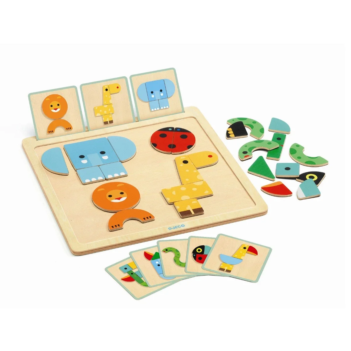 Skab en masse sjove dyr med disse geometriske brikker. Få inspiration fra de medfølgende kort eller skab dine egne fantasidyr. En skøn æske fra Djeco der indføre barnet i former og farver på en sjov måde.