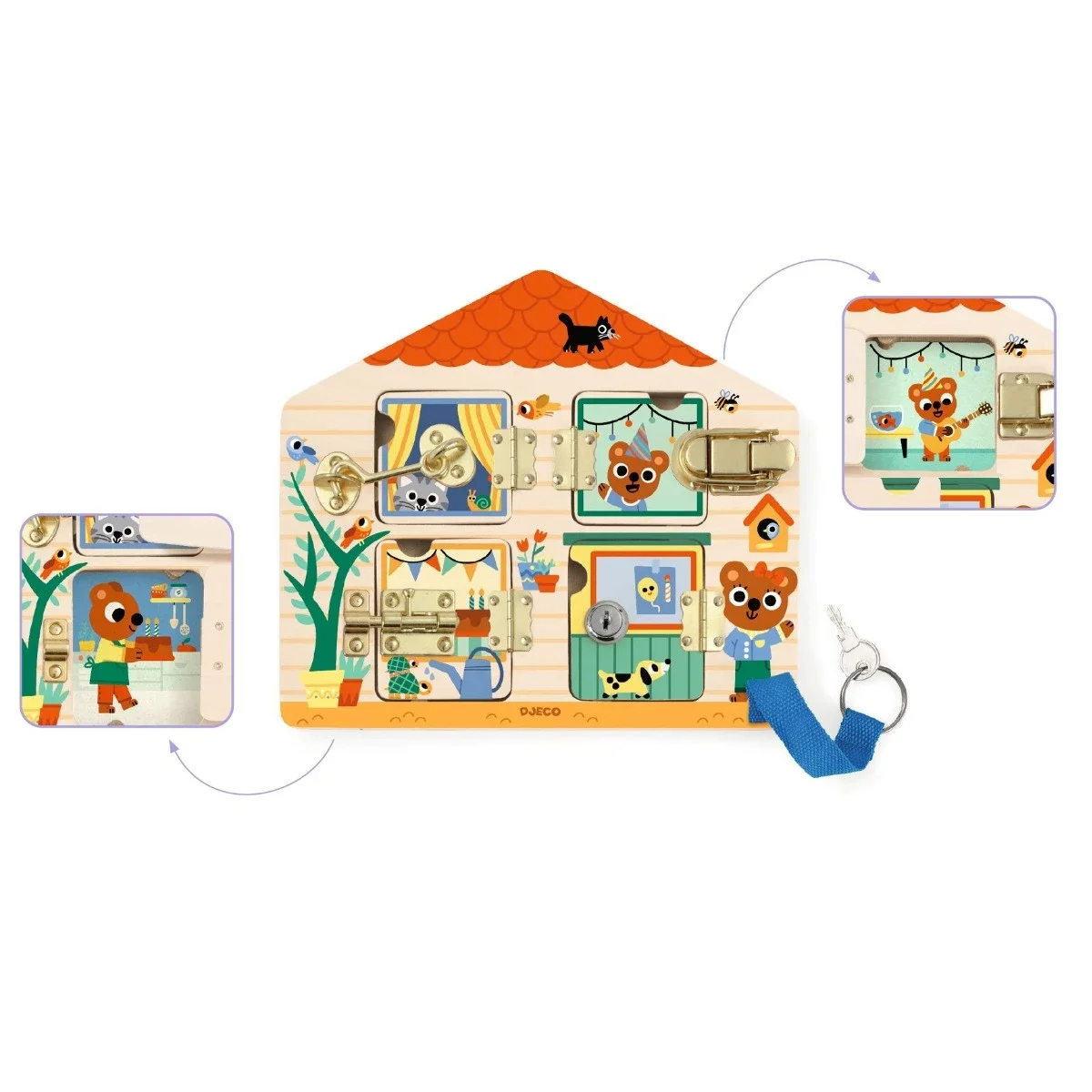 Børn elsker at låse op og i. Her kan de rigtig blive udfordret på finmotorikken, når alle de forskellige låse skal åbnes op og i, på hver sin måde. Bag lågerne gemmer der sig en sød tegning. Et klassisk legetøj som børnene elsker.