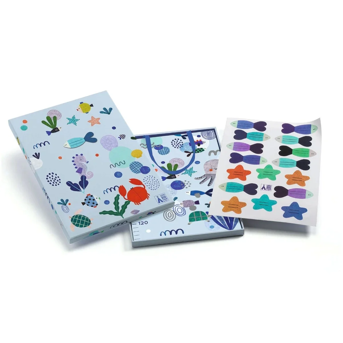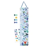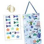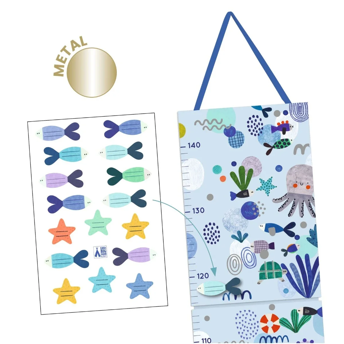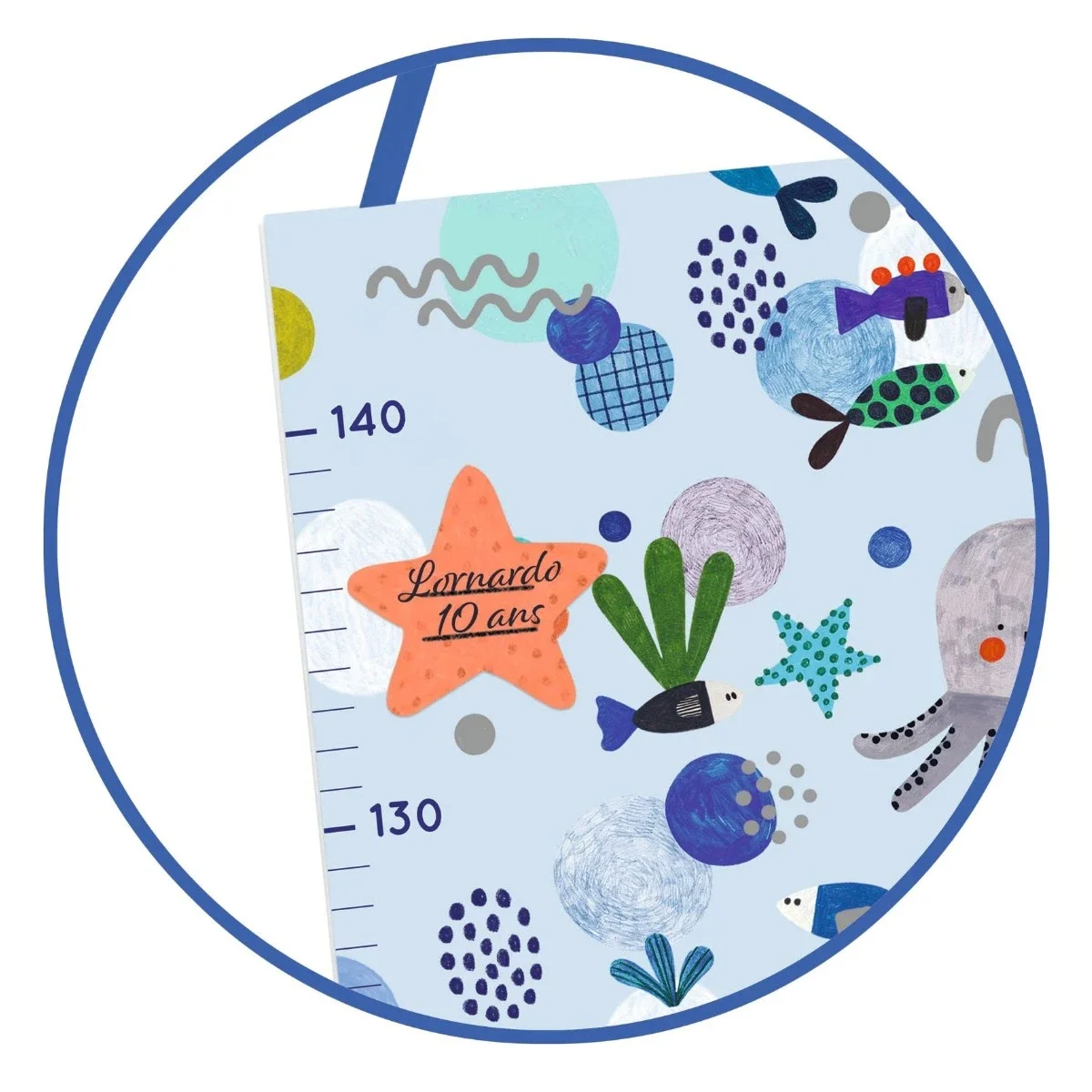 DjecoŽs højdemåler er lige til at folde ud og hænge op på væggen. På de medfølgende stickers kan man notere barnets navn og dato , og klæbe på højdemåleren så man kan følge med i barnets udvikling.