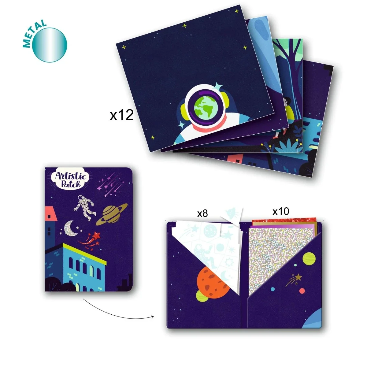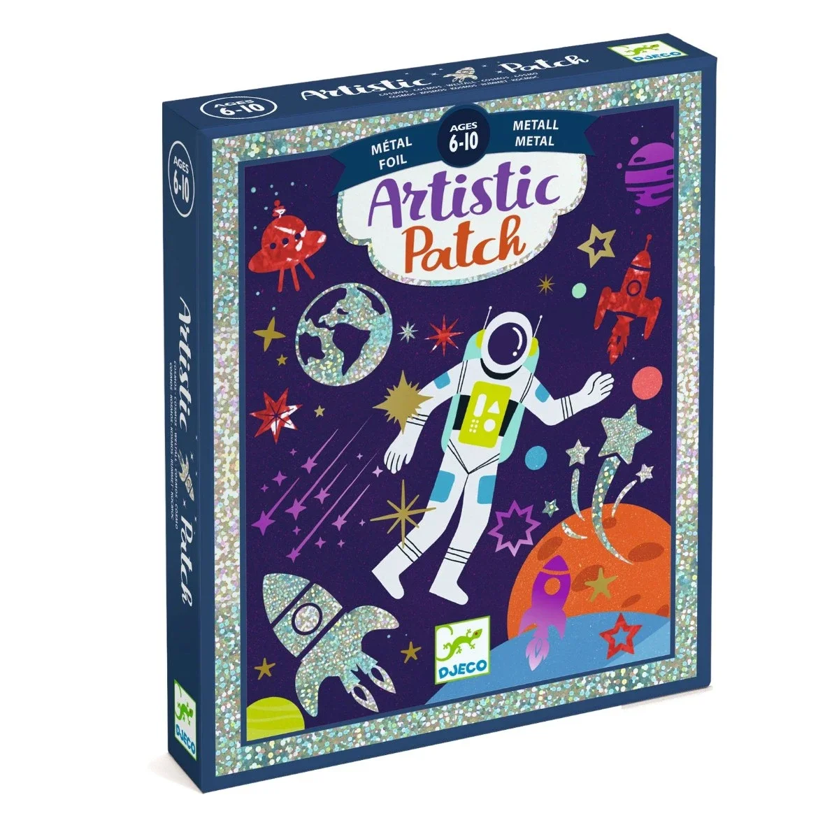 Artistic Patch fra Djeco er en sjov og anderledes måde at lave fine kreative billeder på. Vælg først en af de forskellige lim-stickers og sæt på dit billed. tag derefter en af farverne og gnub ovenpå. Wupti! så træder der pludselig en figur frem på billedet i den valgte farve.