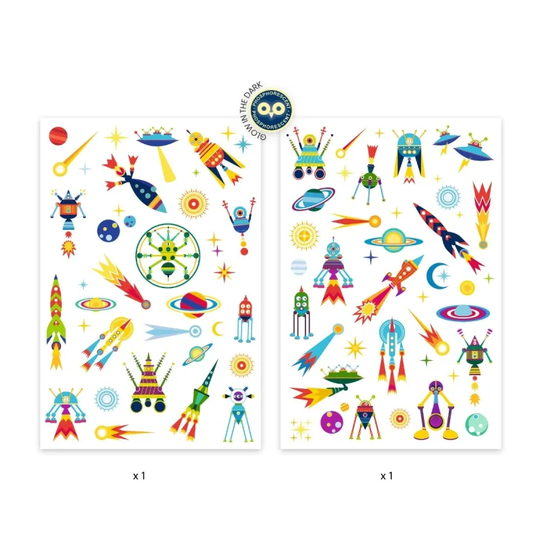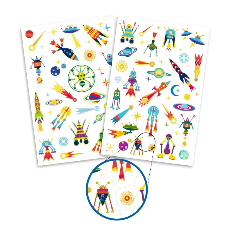 Skønne tatoveringer med motiver fra rummet. Rumraketter, stjerner, planeter mm