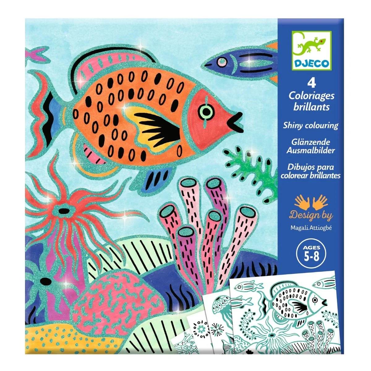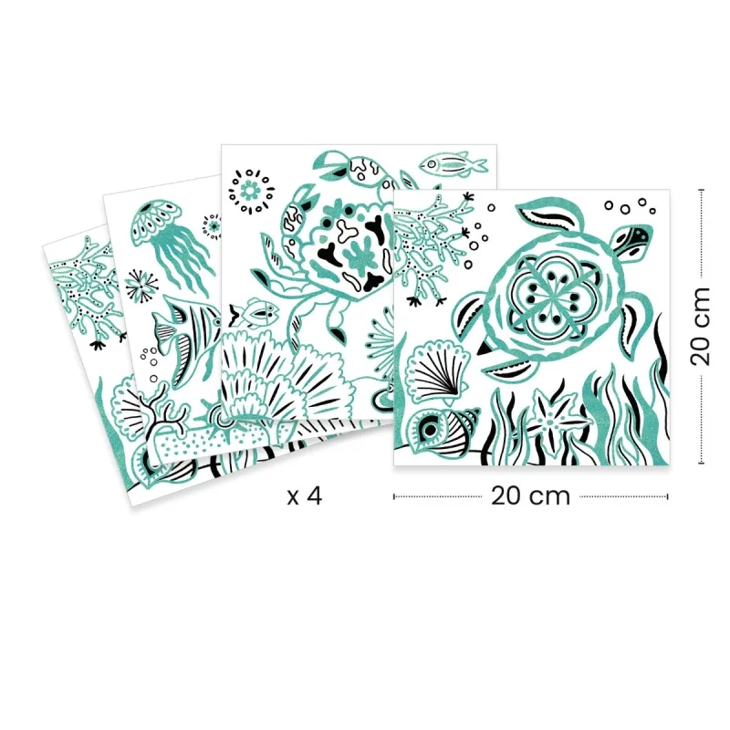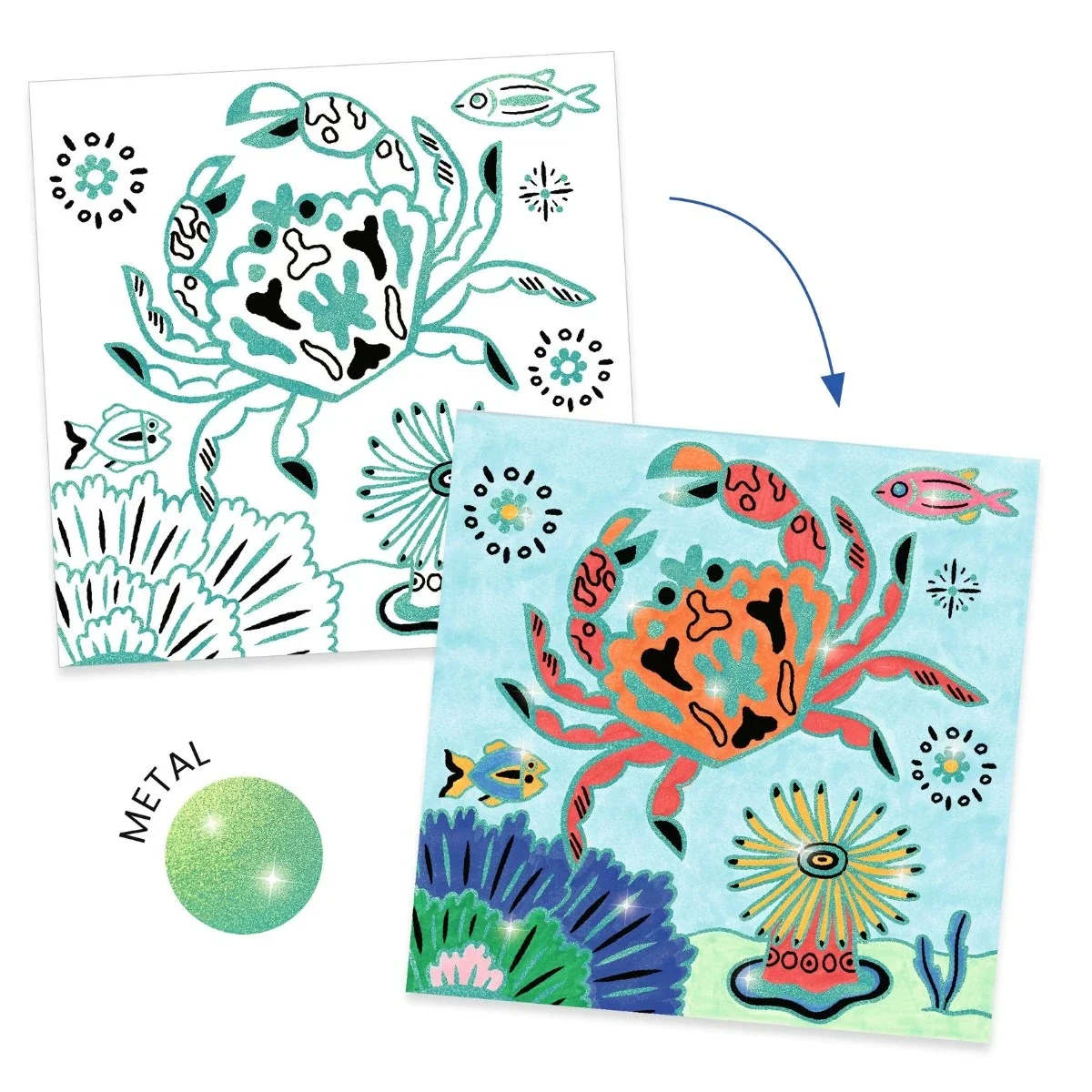 Fire fantasifulde tegninger skal farvelægges. En tyk hævet kant sørger for, at du ikke tegner uden for stregen. En metallisk lak lyser billedet flot op. Der medfølger en farvet udgave at billederne som inspiration af farvevalg for hvert billede. End flot kreativ pakke fra Djeco, til dig der elsker havets dyr.
