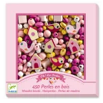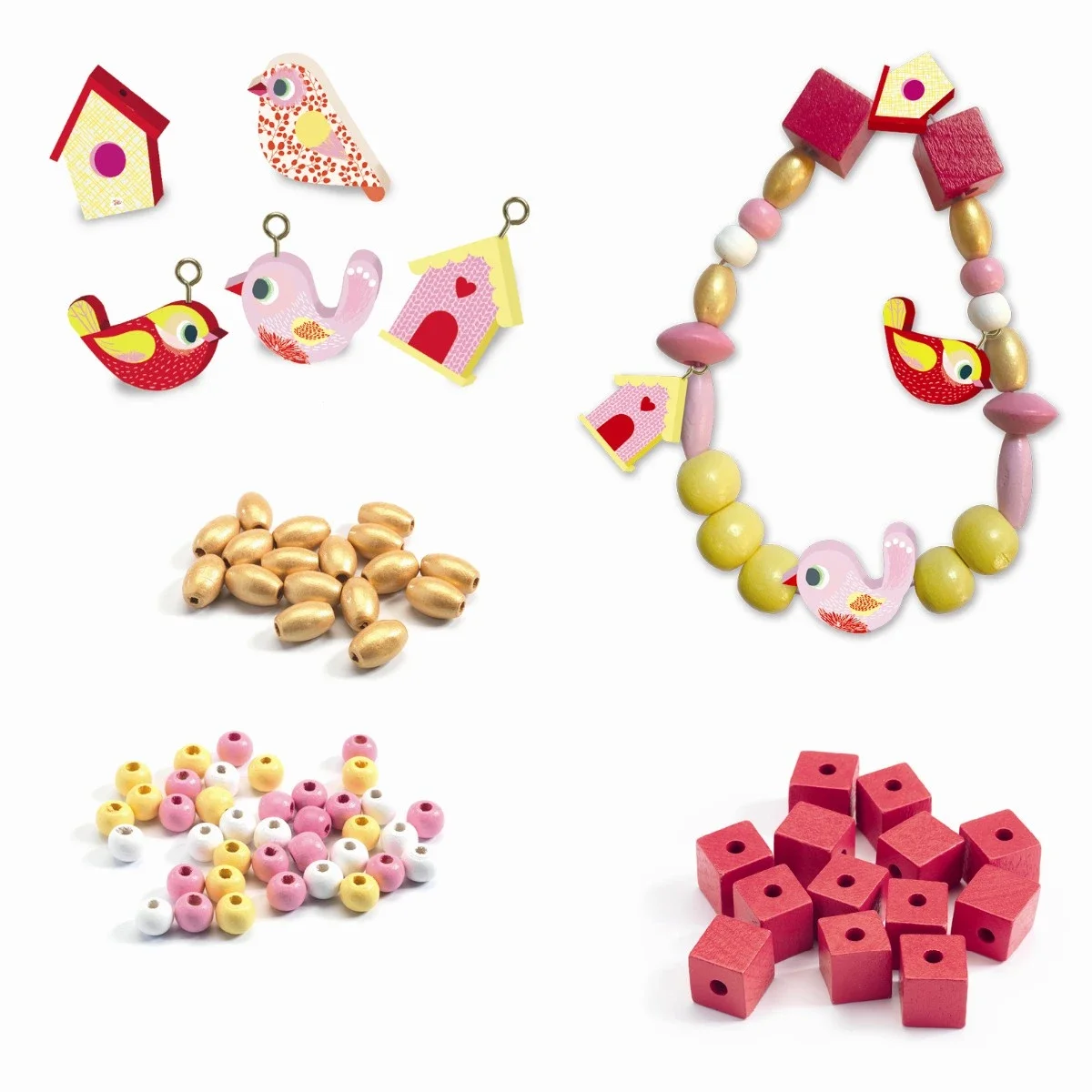 En æske fuld af smukke træperler fra Djeco med temaet fugle. Træk perlerne på den medfølgende snor og lav dine egne smykker.