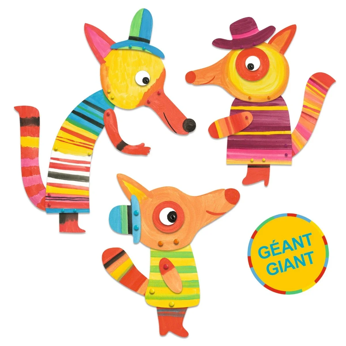 Start med at farvelæg, hele familien ræv med den medfølgende farvelade, sæt dem sammen. Den største ræv måler 52 cm.