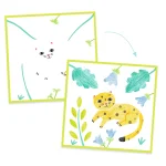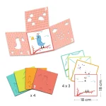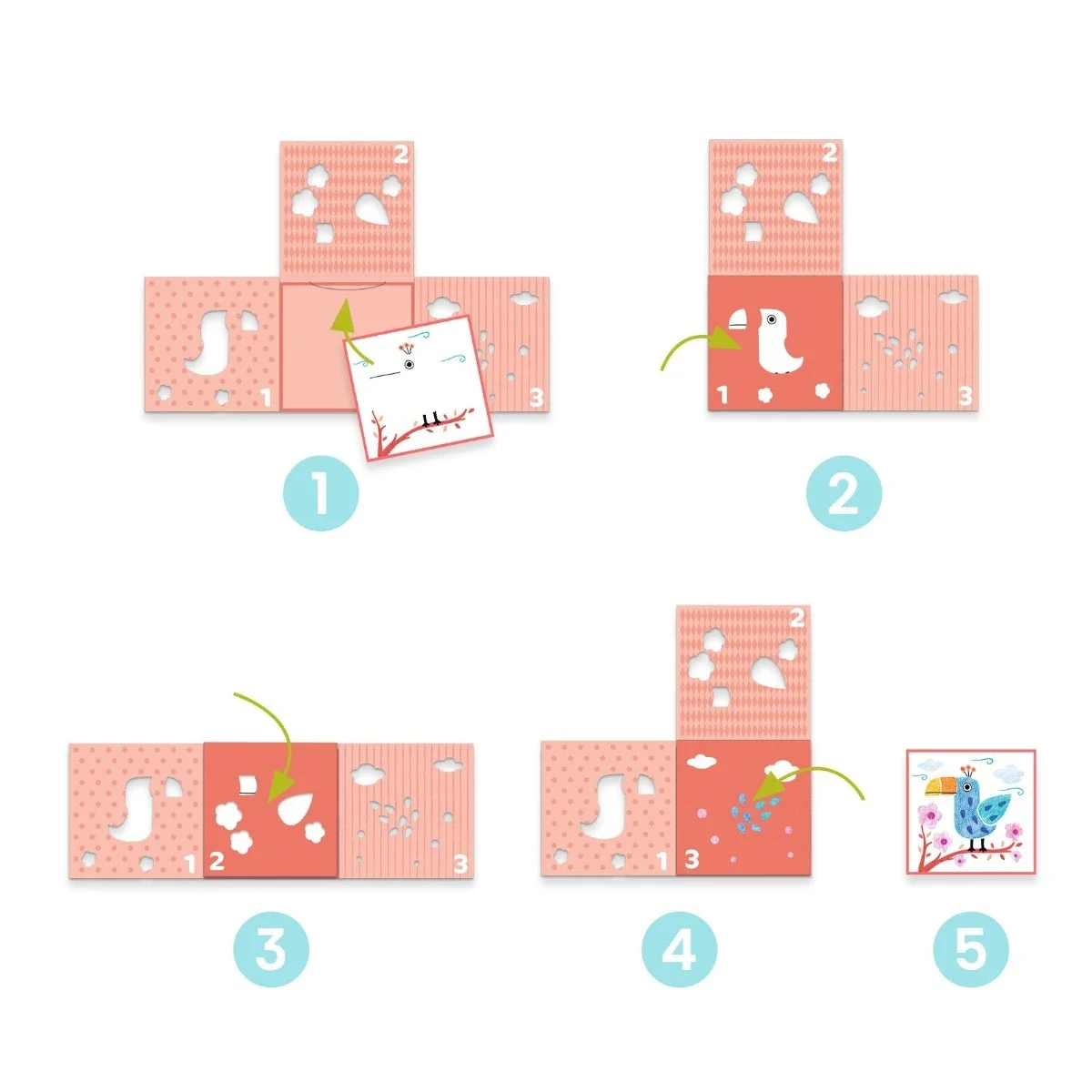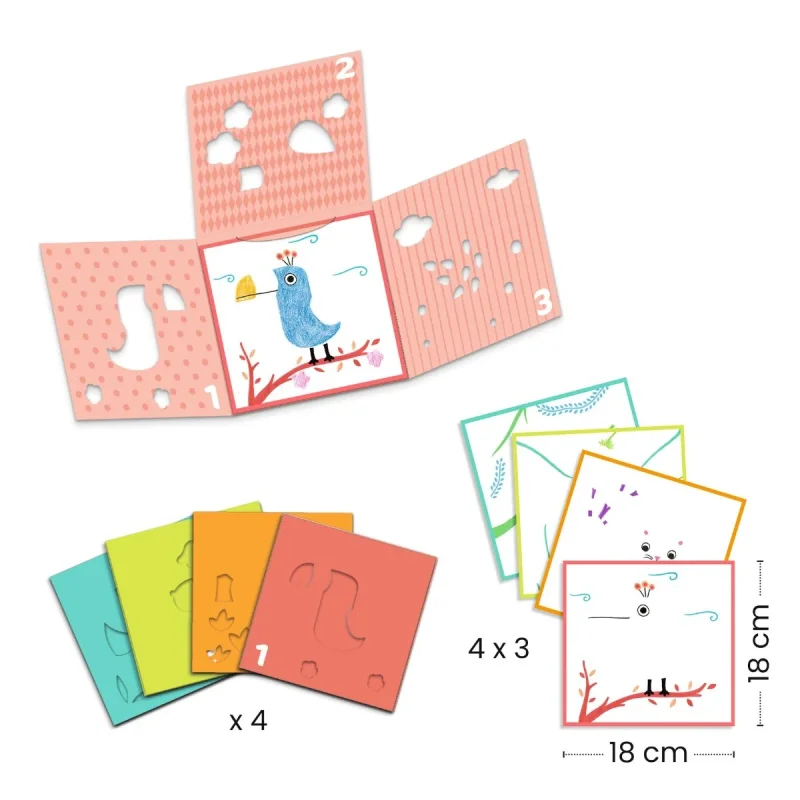 Lav sjove tegninger med hjælp af stencil, til hvert motiv er der 3 sider der skal foldes over tegningen på skift, når man er færdig er der et fint motiv.