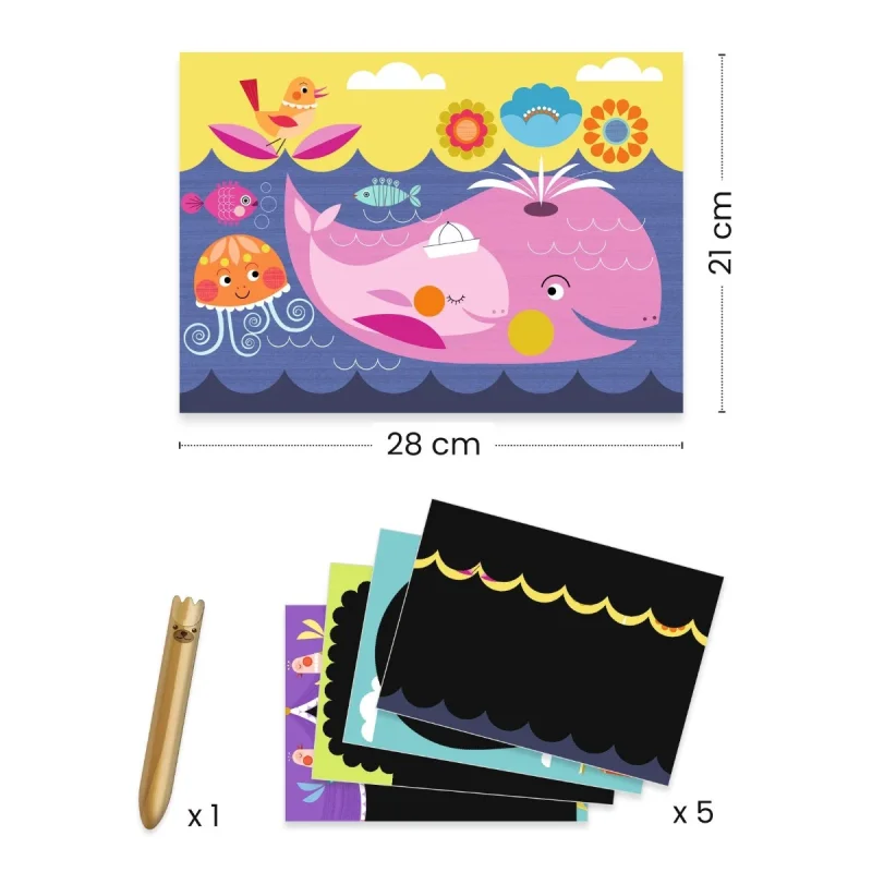De mindste kan også prøve kræfter med de sjove scratch kort fra Djeco. Med træpinden skal alt det sorte skrabes væk, og herunder gemmer der sig et flot og farvestrålende billede. De mindste vil undres og glædes over at se, at der kommer et motiv til syne.