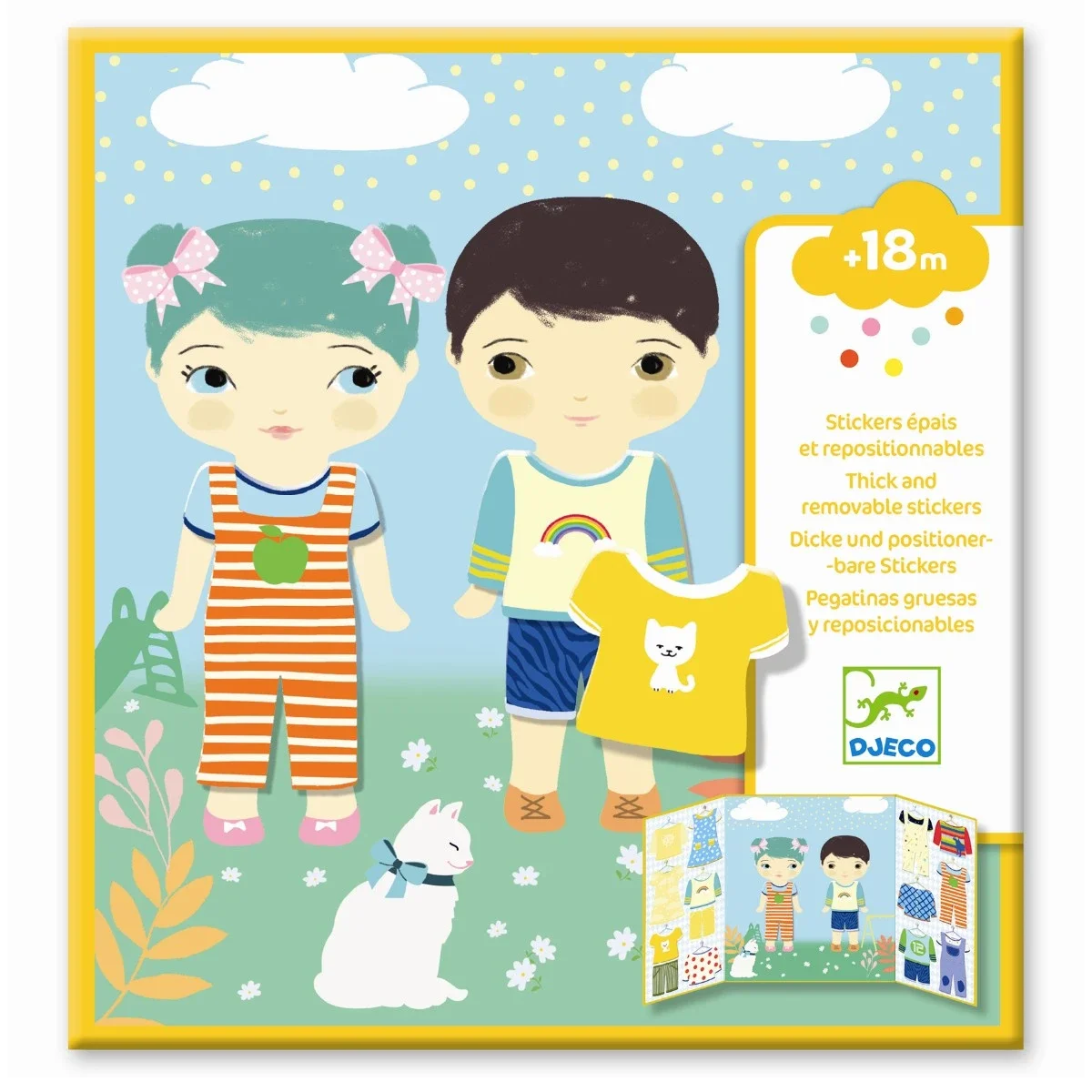 Denne fine pakke er perfekt at have med på rejse, på besøg m.m. De tykke klistermærker med tøj kan sættes på pigen og drengen igen og igen. Du har nemt overblik over alt deres tøj i garderoben ved siden af børnene på kortet.