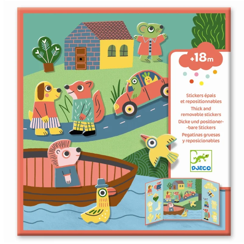 På kortet med landskabet kan du sætte de tykke klistermærker på igen og igen. En sjov beskæftigelse for de mindste, der er praktisk at tage frem, når man skal finde lidt hurtigt underholdning på f.eks. Rejsen eller når du er ude som gæst.