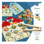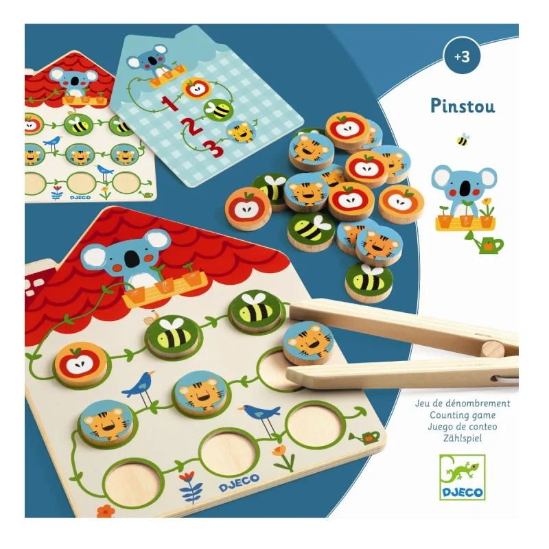 Lær rækkefølgen! Barnet skal se på kortet, hvilke brikker der skal lægges på. Når barnet har placeret brikkerne med træpincetten, vendes kortet og man kan se, om de er placeret rigtigt. Barnet kan også selv lægge brikkerne helt som det selv vil, måske kan man bruge pincetten til at stable dem med. Djeco laver mange fine trælærespil.