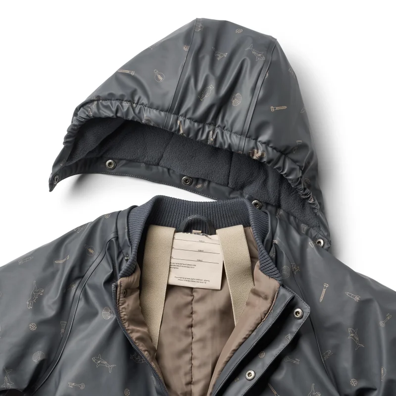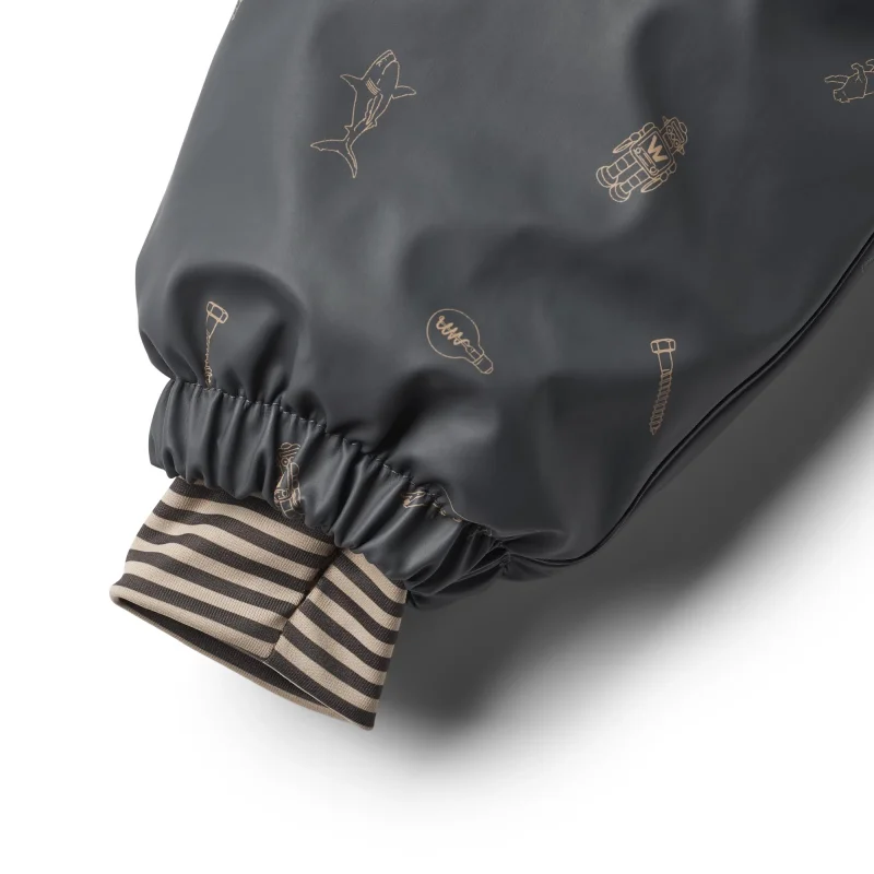 Dragten har mange praktiske detaljer såsom aftagelig og justerbar hætte, ribkrave og vindmanchetter. Den har også indsyet elastiske seler, som giver dit barn mulighed for at have dragten halvt af med armene fri, hvis det skulle blive for varmt eller I er indendøre for en stund.