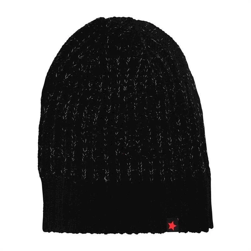 Chunky strikket hue i uldblanding i farven 'Black' med fine guldglittertråde. Kan bruges både med og uden ombuk.