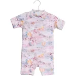Sød heldragt med et fint håndtegnet print. Dragten er med korte ærmer og ben, med krave og lynlås i ryggen.