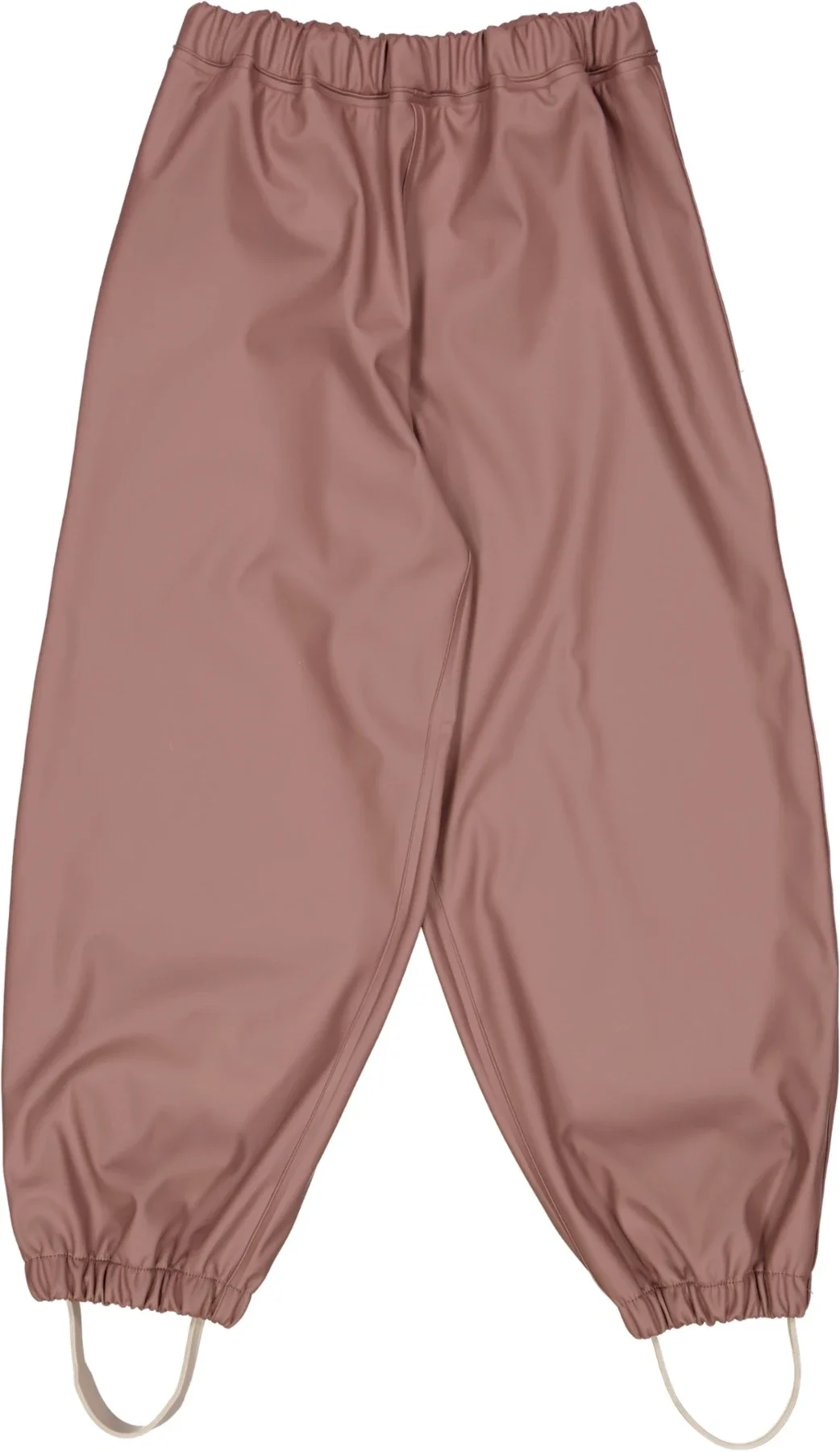 Regnbukserne har elastik i taljen og aftagelige- samt justerbare gummi fodstropper, så bukserne ikke kryber op ad benet på dit barn.