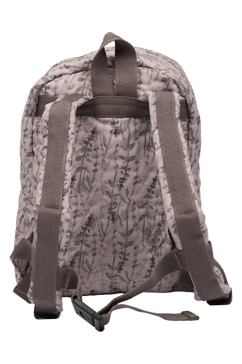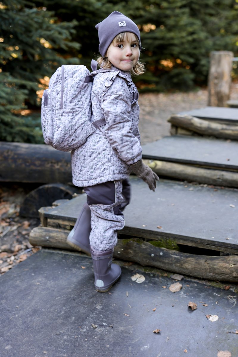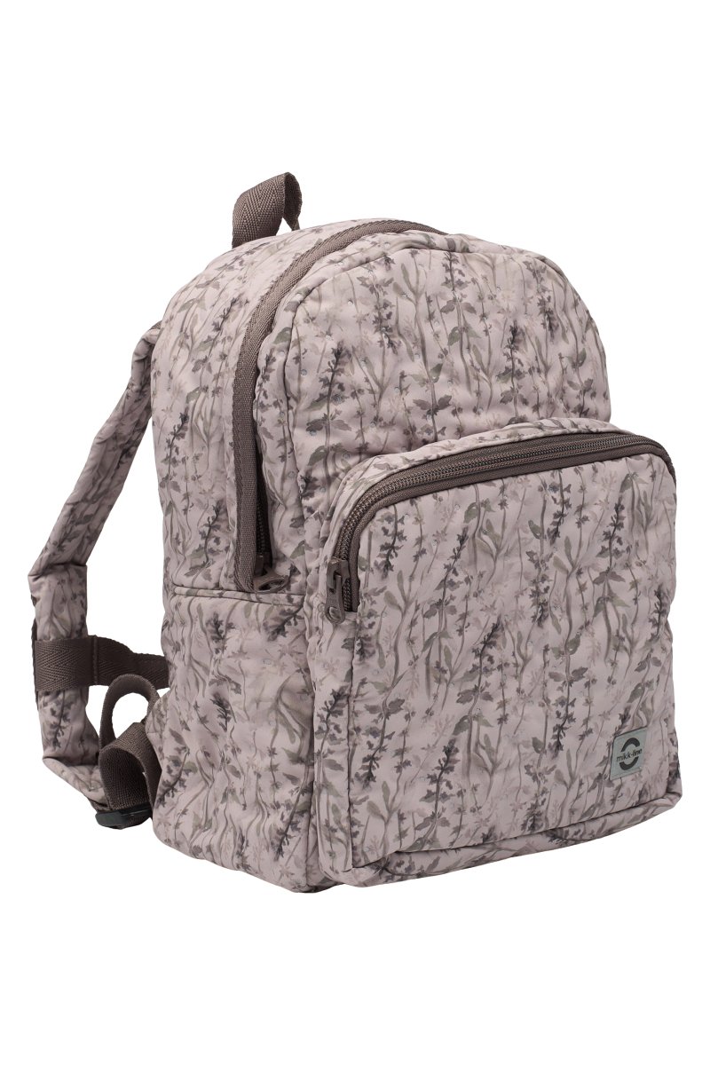 Sød Mikk-Line børnehavetaske i støvet grøn med et efterårsprint med blade, kogler, agern og biller i brune og grønne nuancer.og med en quiltet struktur.