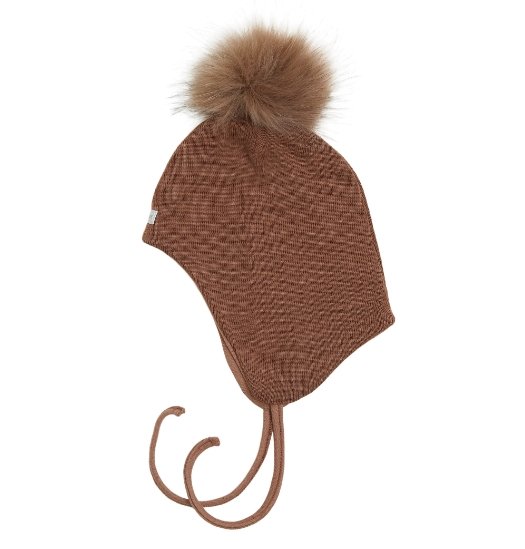 Racing Kids - Wool Baby Helmet With Pompom - MoccaFin og praktisk uld hue med kvast på toppen i faux fur