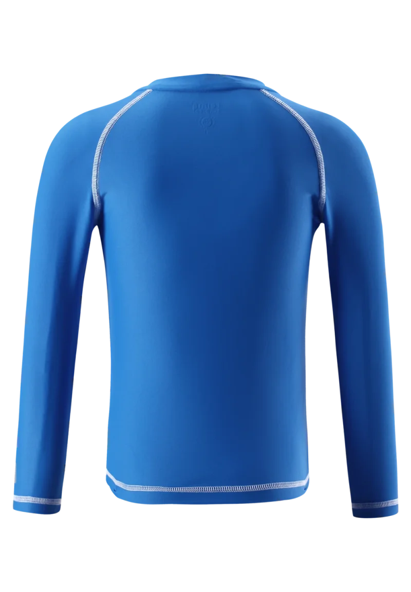 Vælg lange ærmer, hvis du vil have fuld beskyttelse. Denne langærmede bluse i SunProof-materiale til børn har solfaktor 50+. Det elastiske materiale tørrer hurtigt og sikrer mange timers komfort i solen! Blusen kan bruges til leg i såvel vandet som på stranden, hvor den rundede talje bagpå giver ekstra beskyttelse i lænden.
